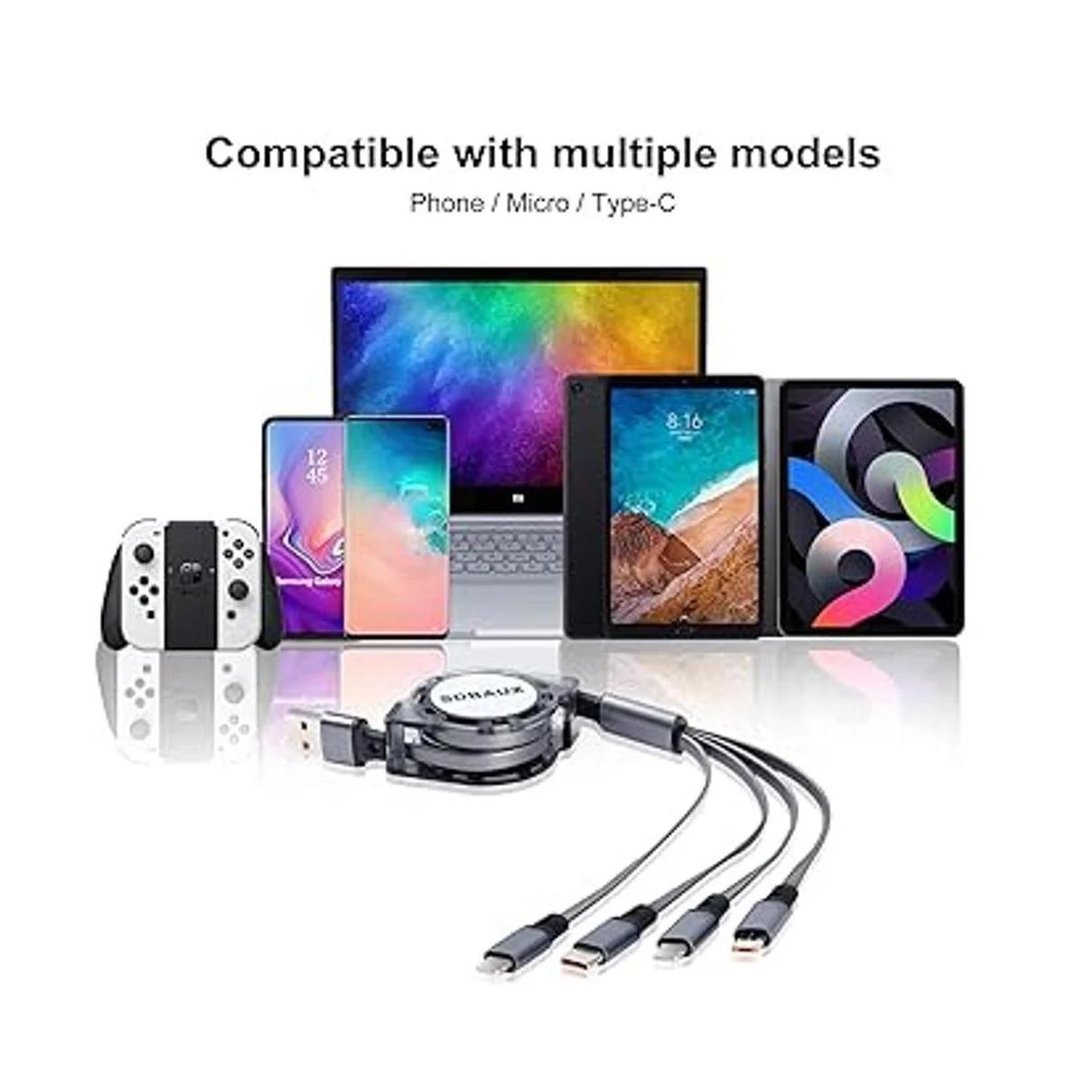 SDBAUX Retractable Multi USB Charging Cable 3A 4 in1 Fast Charger Connector with Dual Phone Type C Micro USB Port Cord,Compatible Tablets Smart Phone and More
