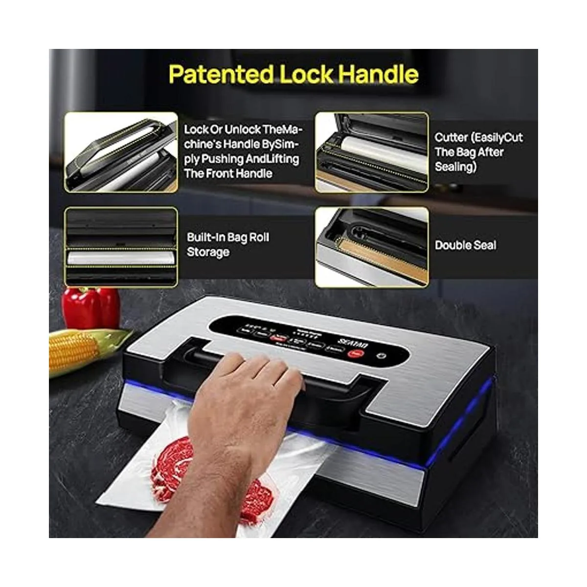Seatao VH5188 Máquina selladora al vacío comercial, máquina selladora al vacío multifuncional de 90 Kpa con modos secohúmedos y luces indicadoras LED, diseño bloqueado con manija, para almacenamiento de alimentos herméticos y plateado