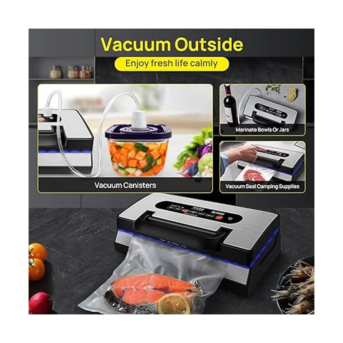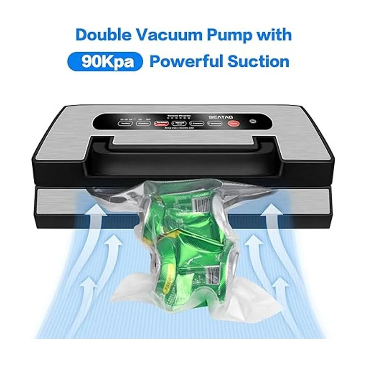 Doble bomba y doble cable de calefacción: la máquina selladora al vacío Seatao VH5188 incorpora una bomba de vacío doble de alta calidad con potente succión de 90 Kpa que crea un sello hermético para bloquear la frescura. El doble cable de calefacción garantiza un mejor efecto de sellado y un nivel óptimo de vacío y evita cualquier posibilidad de fugas.