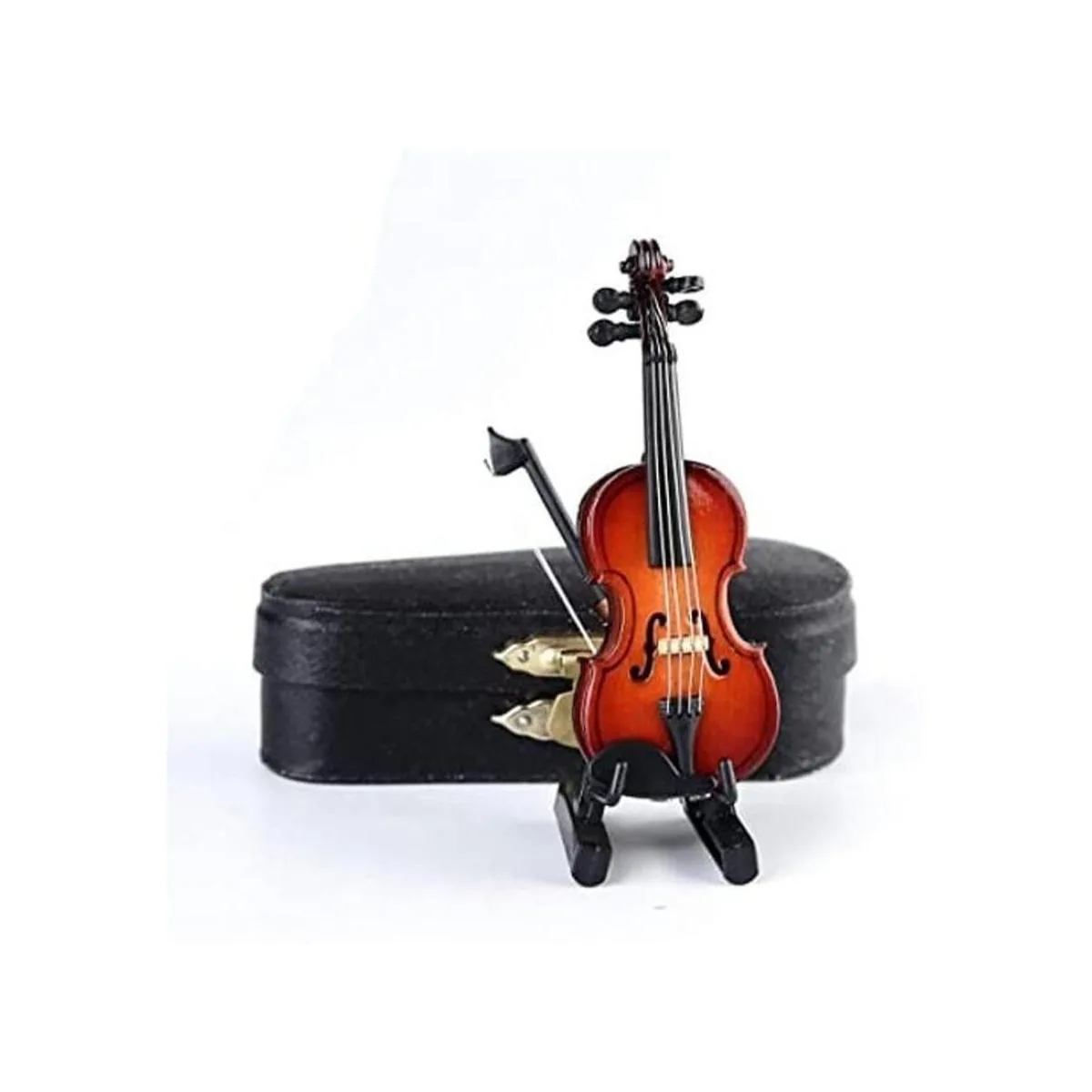 Seawoo Violín en miniatura de madera con soporte, arco y estuche, mini instrumento musical, modelo de casa de muñecas, adorno para decoración del hogar