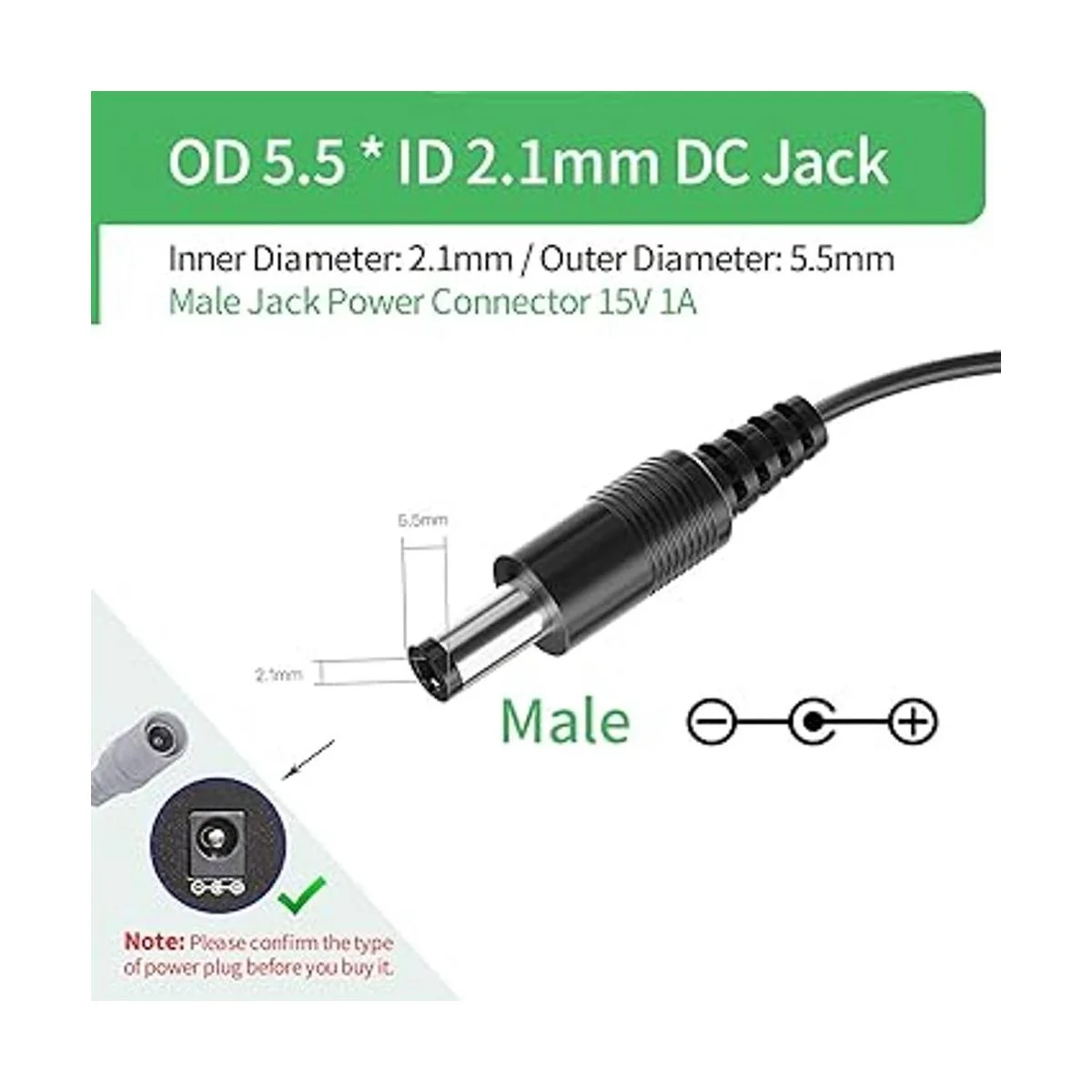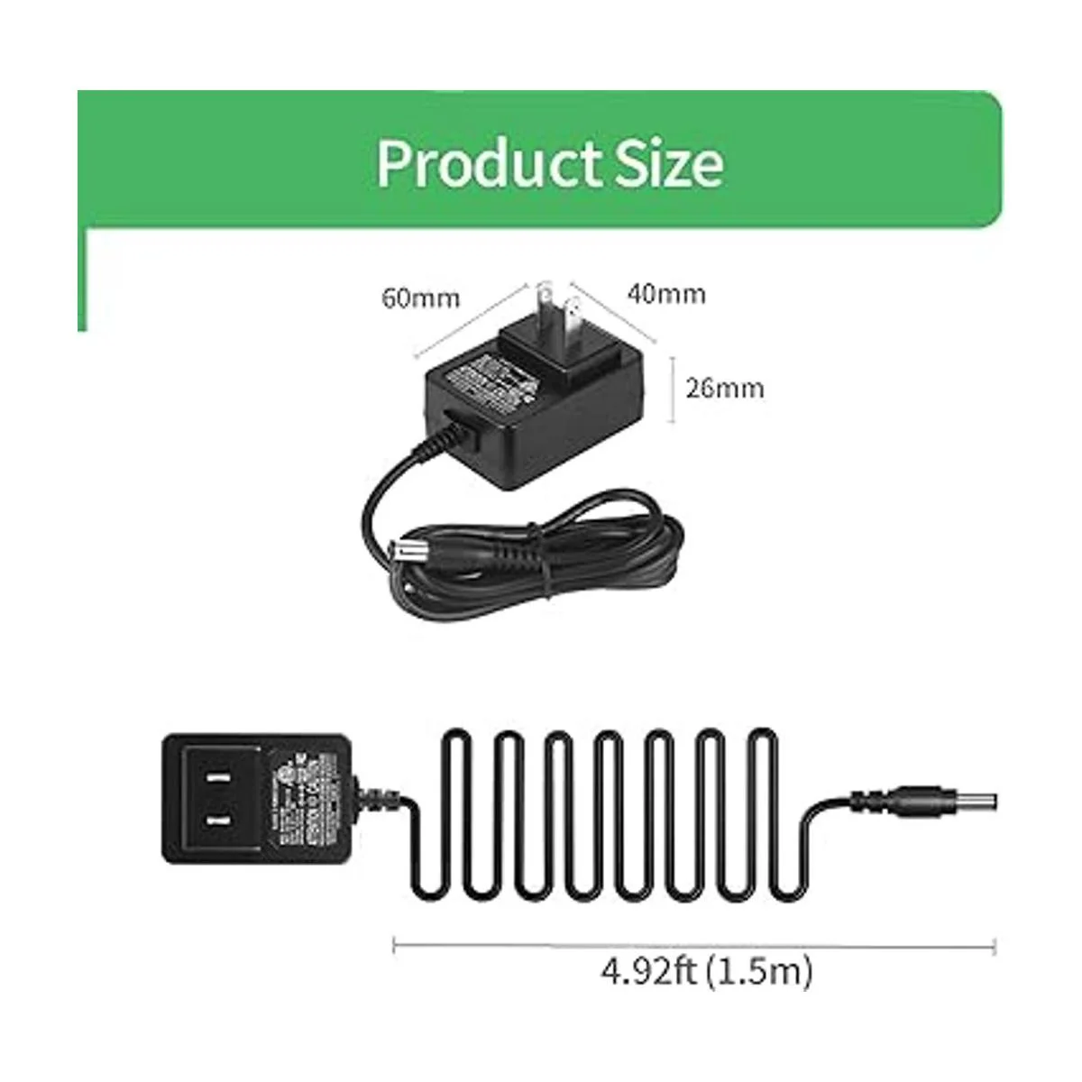 Tamaño del conector CC: 0.217 in x 0.083 in, longitud del cable: 4.9 ft