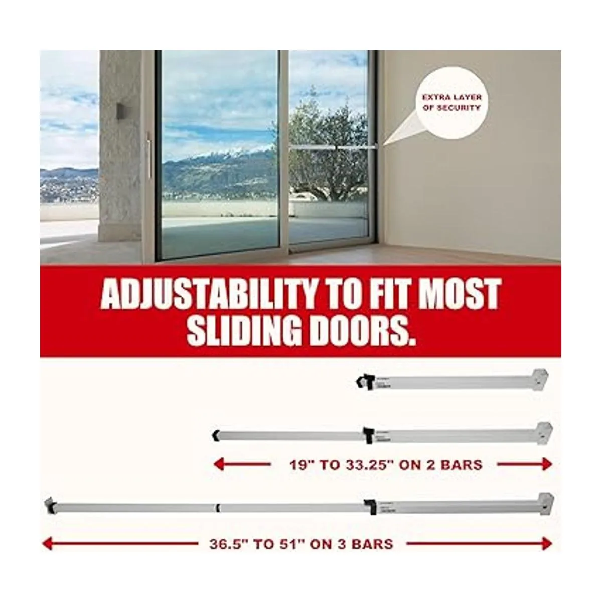 El mejor ajuste del mercado: ajusta la barra para puerta corrediza de 19 a 51 pulgadas 19 a 33.25 pulgadas en 2 barras, 36.5 a 51 pulgadas en 3 barras para que puedas quedarte tranquilo cuando dejes la puerta parcialmente abierta o si simplemente quieres seguridad adicional.