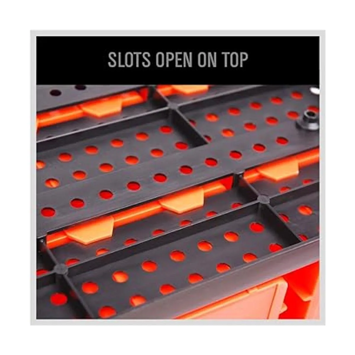 Contenedores de almacenamiento multifuncionales: incluye 9 pequeños cajones azules, 9 pequeños cajones naranjas y 12 cajones rojos grandes con 2 tablas de montaje y 8 tornillos de fijación de pared para almacenar y organizar accesorios de herramientas y piezas pequeñas desde tornillos, tuercas y pernos, destornilladores, martillos y alicates, aparejos de pesca, suministros de oficina, materiales de manualidades, cuentas, etc.