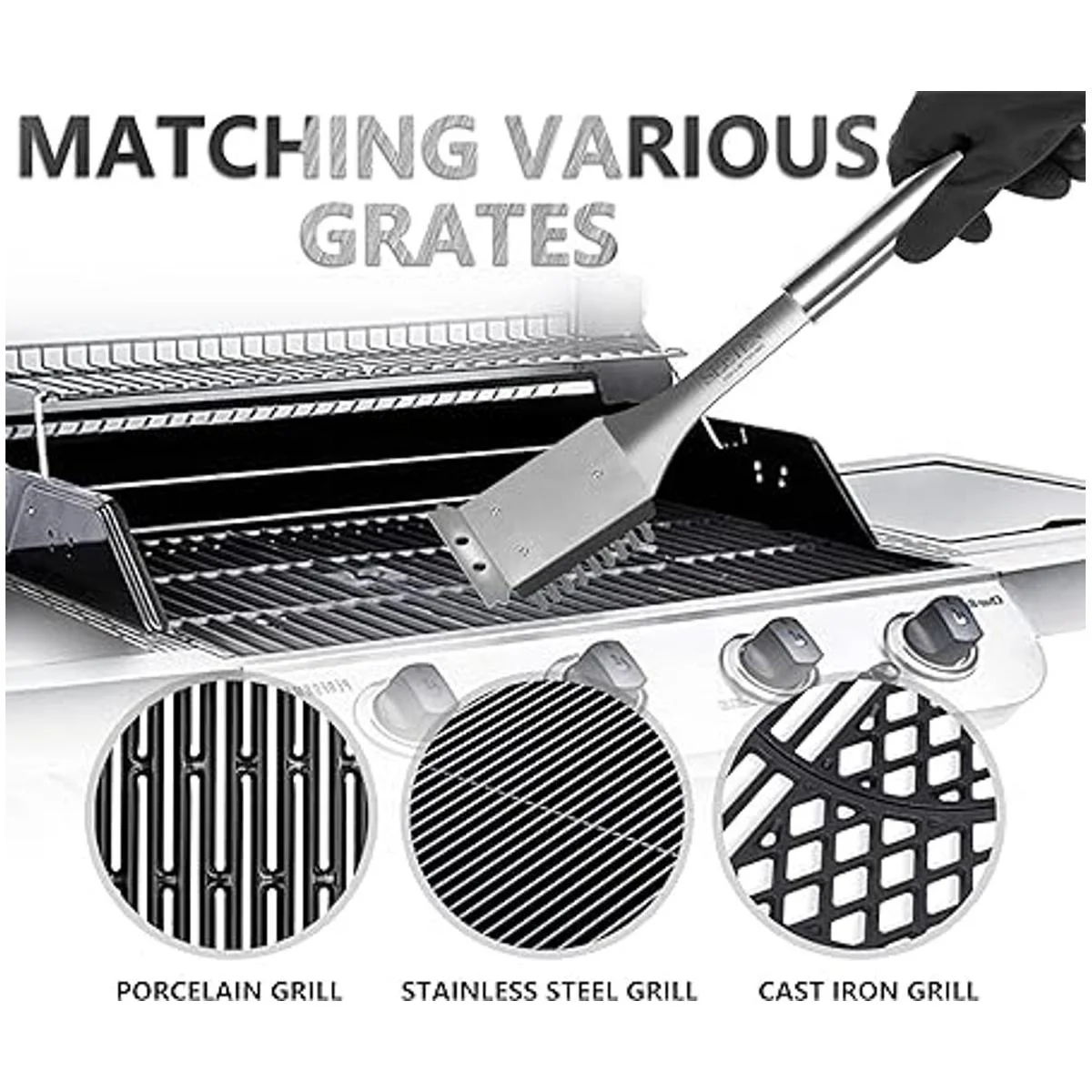 A juego con varias parrillas El cepillo de limpieza de parrilla SEETEN se adapta a parrillas de gas, carbón, porcelana, ahumador, acero inoxidable u otros tipos como parrilla Weber. El cepillo de 16 pulgadas de largo con un ángulo perfecto se adapta a todos los tamaños de parrilla y protege tus manos de quemaduras. Descubrirás que el proceso de limpieza nunca ha sido más eficaz