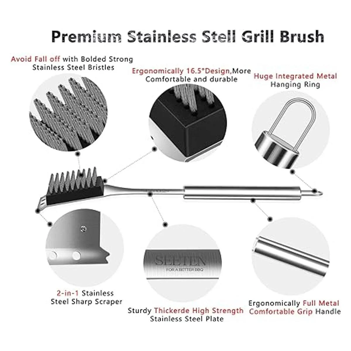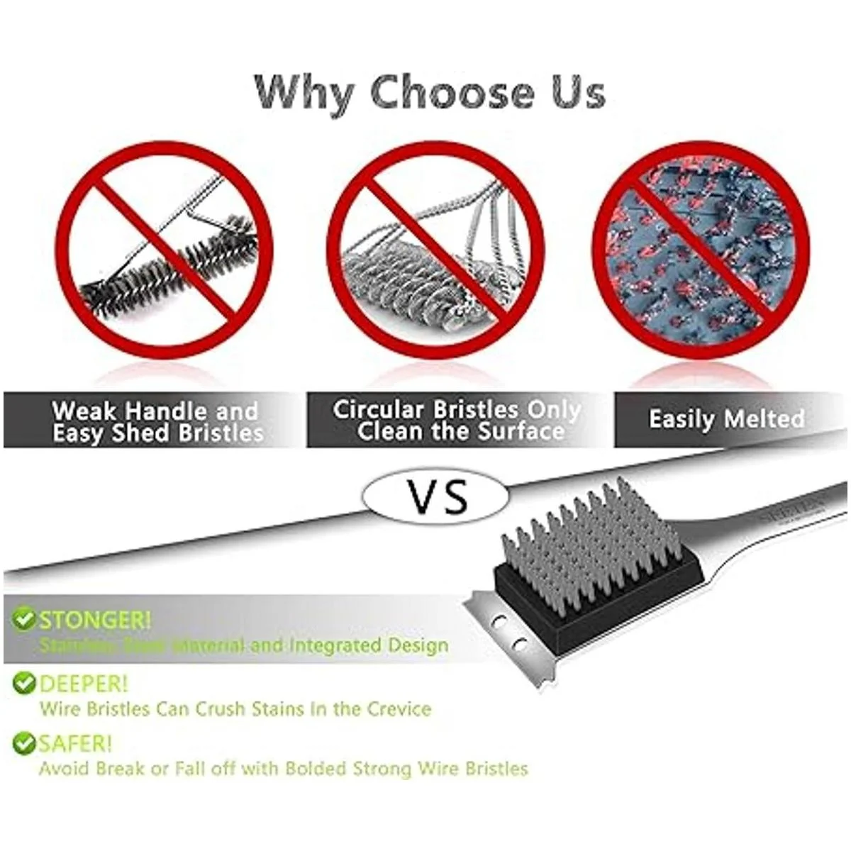 Cepillo y rascador de acero inoxidable todo en uno: el cepillo de parrilla SEETEN no se derrite como el cepillo de parrilla de nailon. Y la cabeza cuenta con un raspador multifunción que puede limpiar fácilmente las manchas difíciles, dándote una experiencia de barbacoa más limpia y segura.