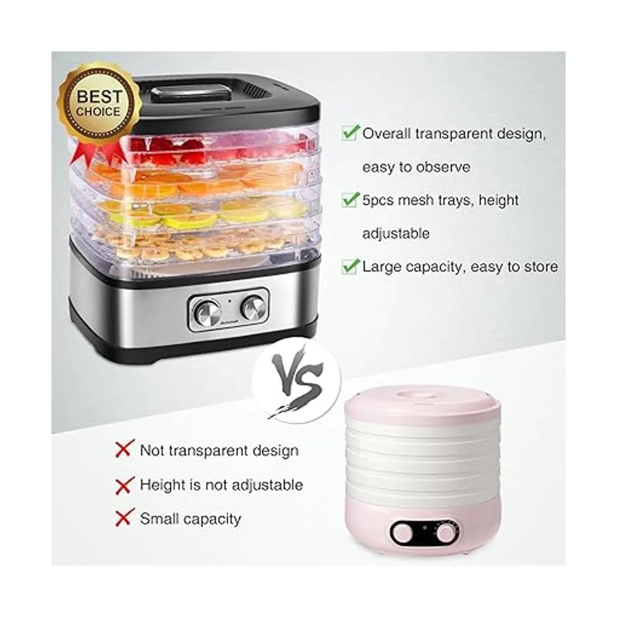 La máquina deshidratadora de cecina incluye 5 bandejas sin BPA con dos formas de colocar y diferentes tamaños. Gira las bandejas de alimentos 180 grados juntas para obtener diferentes alturas 1.3 in y 0.8 in para secar diferentes tamaños de alimentos. Las 5 bandejas te ayudan a secar diferentes alimentos juntos, sin preocuparte por la mezcla de sabores. Y el diseño transparente general se puede observar completamente el proceso de secado sin quitar la funda.