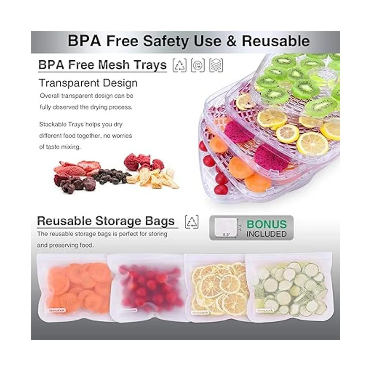 Deshidratador de alimentos con control de temperatura: 95165 95.0 F165.2 F te permite establecer diferentes temperaturas para que los diferentes alimentos se sequen de acuerdo a tus necesidades. Si no hay suficiente tiempo para secar los alimentos en un día, se puede secar al día siguiente. En este caso, sella los alimentos en nuestras bolsas de almacenamiento reutilizables de grado alimenticio que están selladas, a prueba de fugas, impermeables e higiénicas, perfectas para almacenar y conservar alimentos.