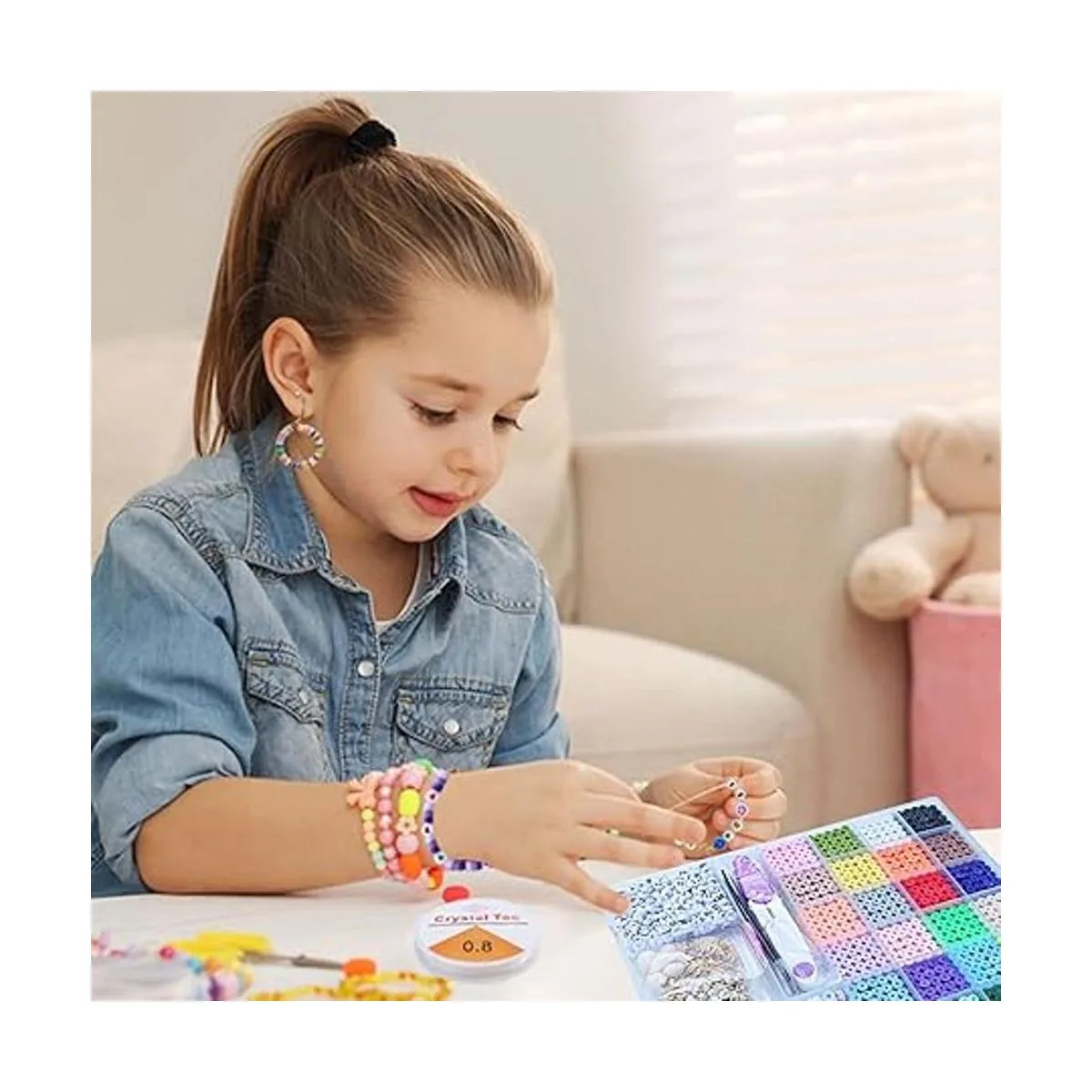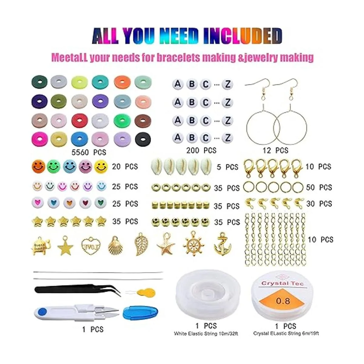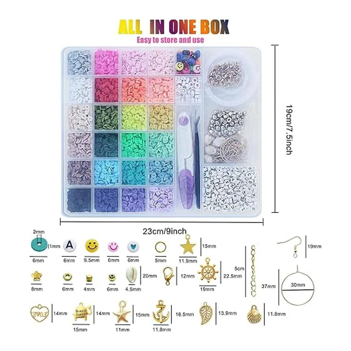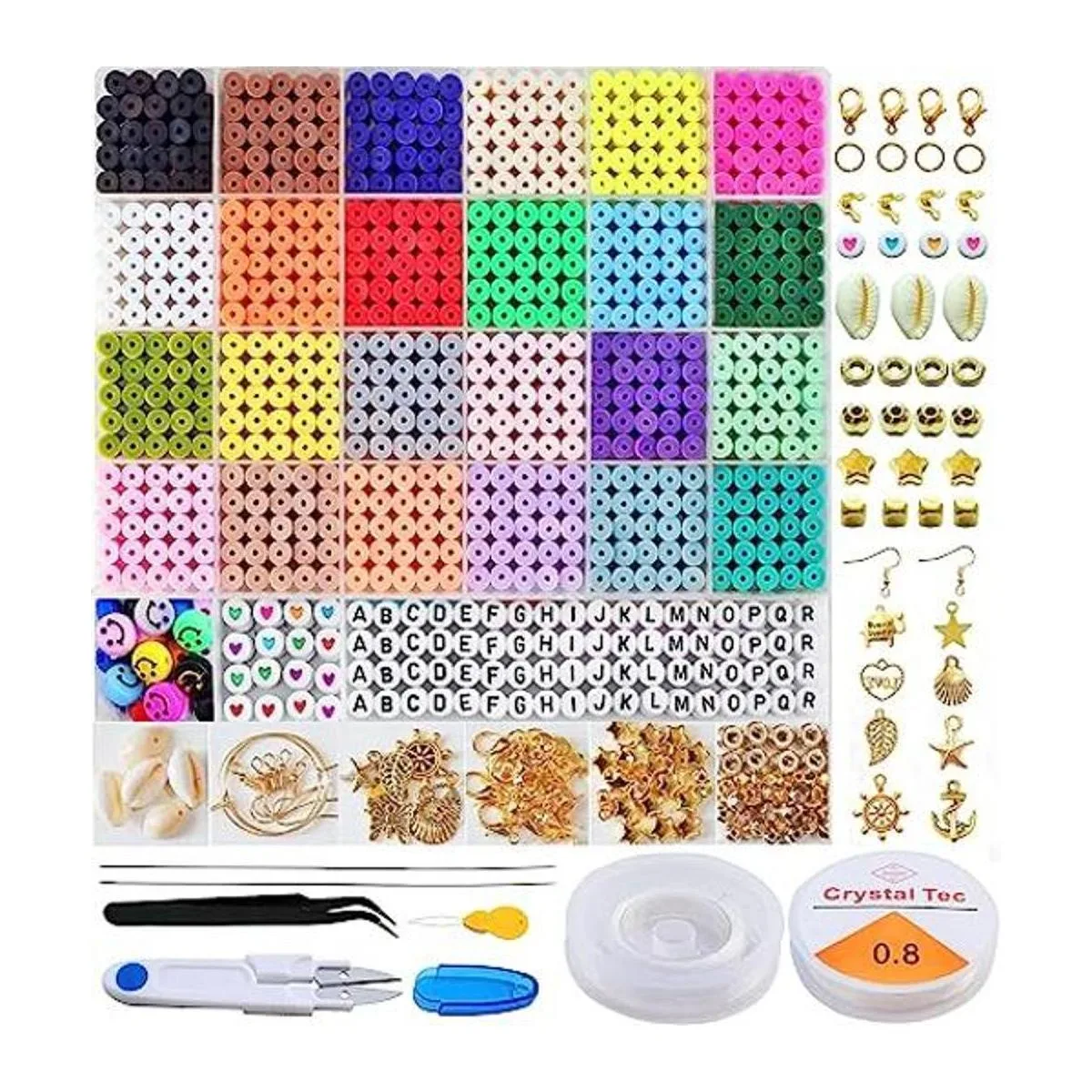 Todo en una caja Una caja de aproximadamente 5520 cuentas planas de arcilla polimérica en 24 colores y 550 dijes contiene cuentas de letras aleatorias, cuentas de sonrisa, cuentas de corazón coloridas, conchas, colgantes, anillos de salto, cierre de mosquetón, etc. , 2 rollos de cuerdas elásticas de 16.4 ft, tijeras y agujas. Artículos que todos los amantes de la artesanía quieren tener.
