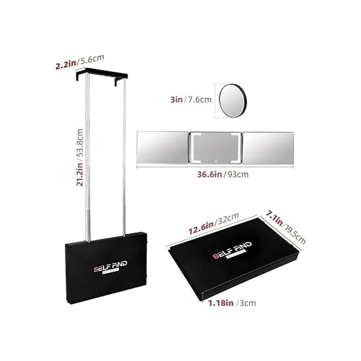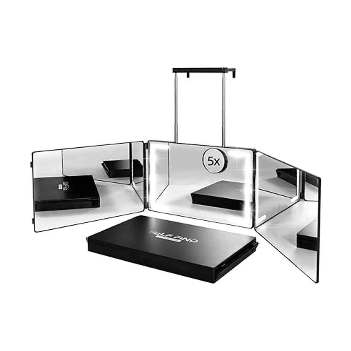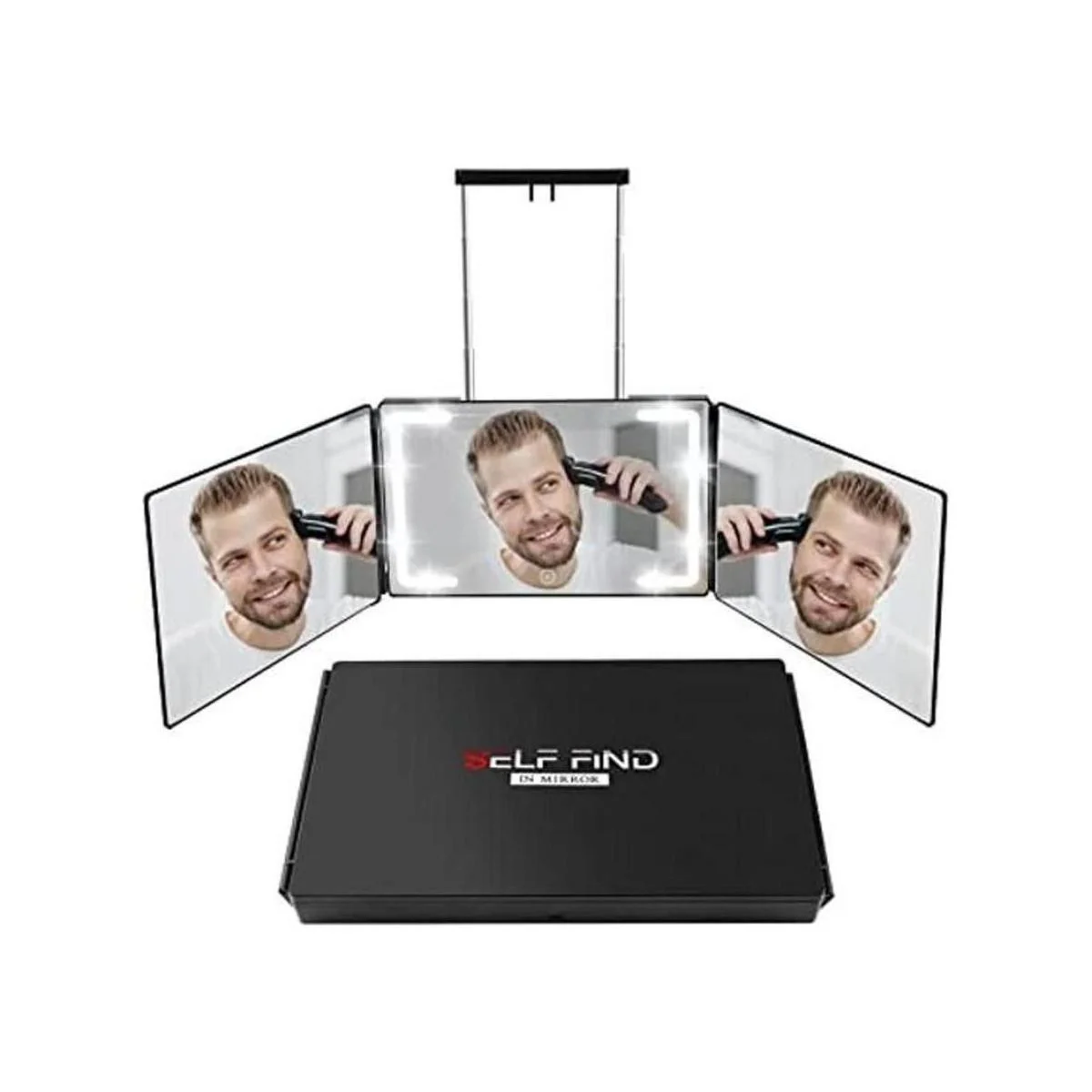 SELF FIND Espejo de 3 vías para autocorte de cabello con anillo de luz, espejo triple LED mejorado, espejo recargable de 360 para herramientas para el cabello, luz y altura ajustable