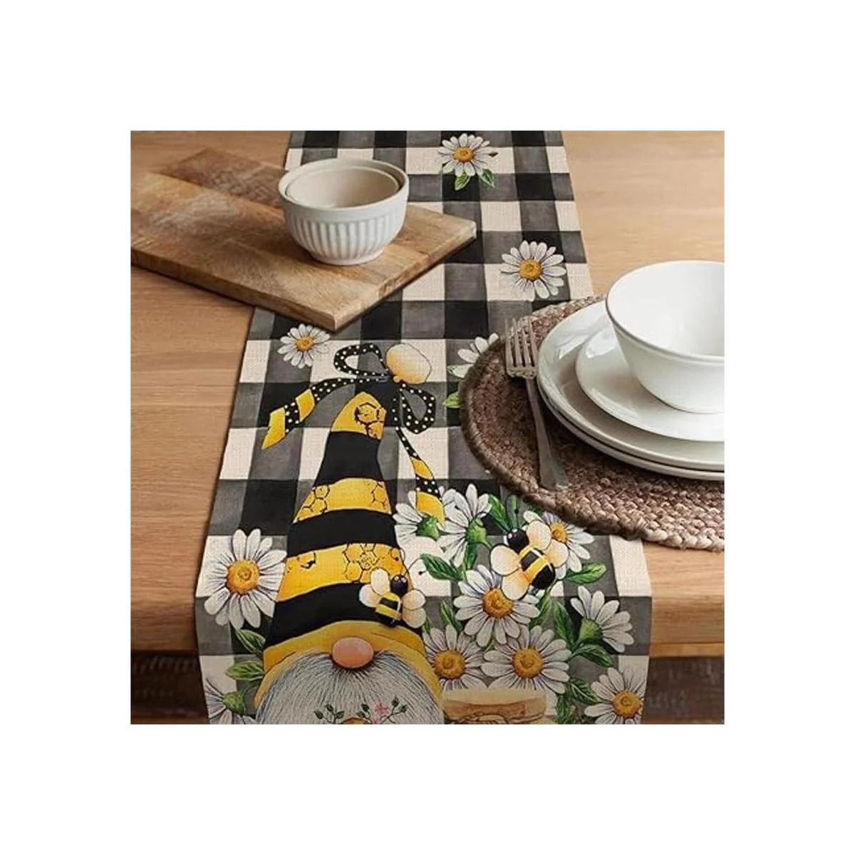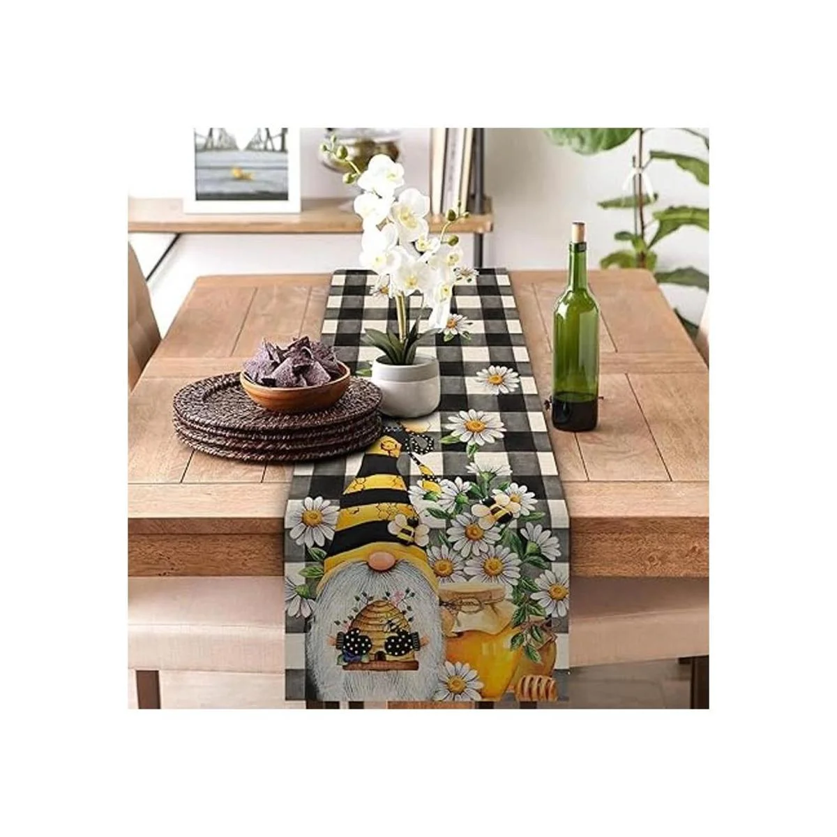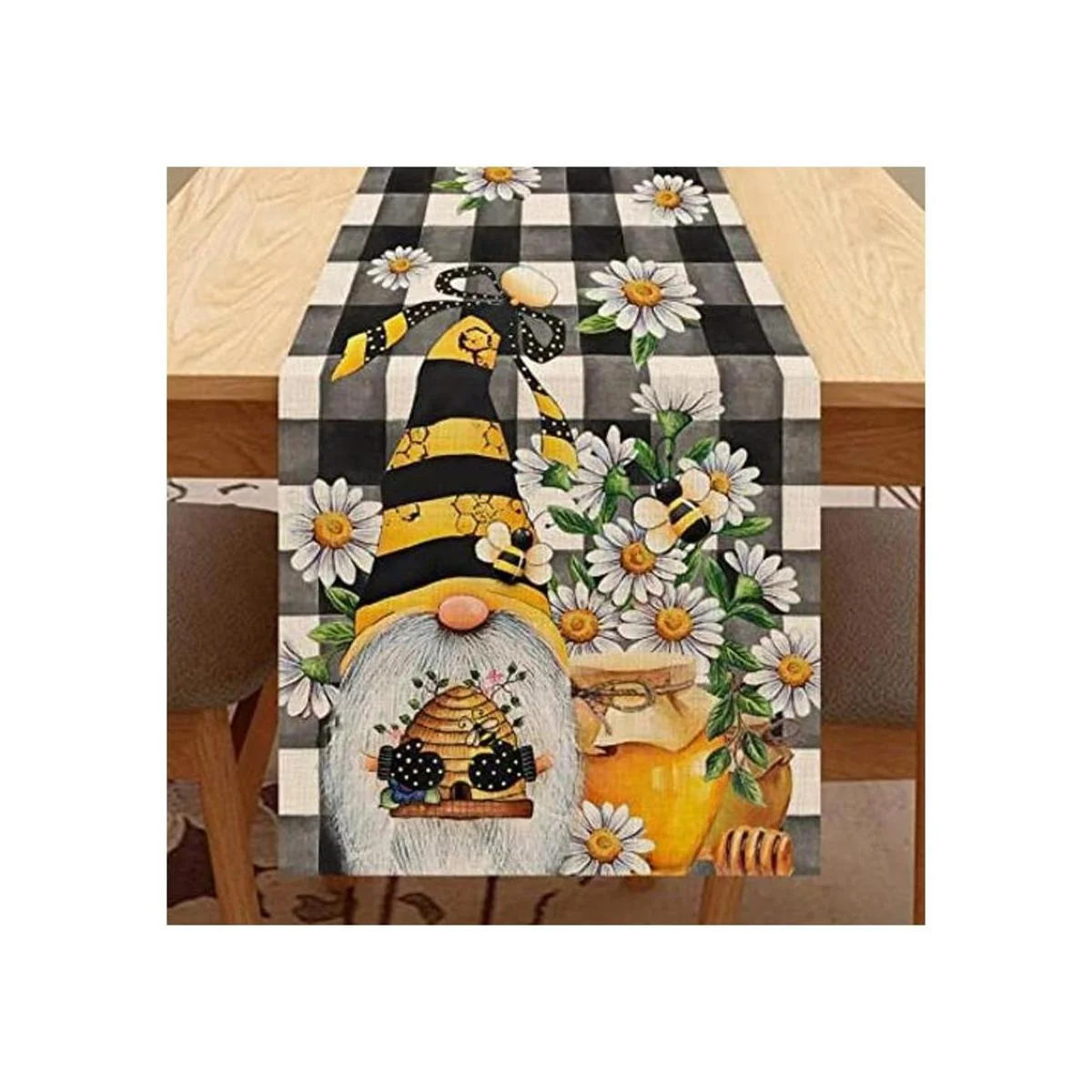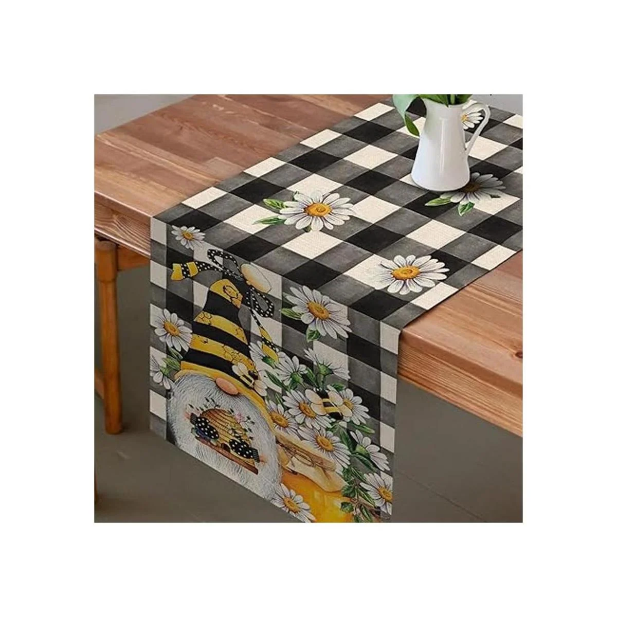 Seliem Camino de mesa de gnomo de abeja de verano, color negro, blanco, a cuadros, decoración de cocina, comedor, decoración de temporada de primavera, decoración de margaritas para interiores y exteriores, suministros de fiesta de aniversario, 13 x 72 pulgadas