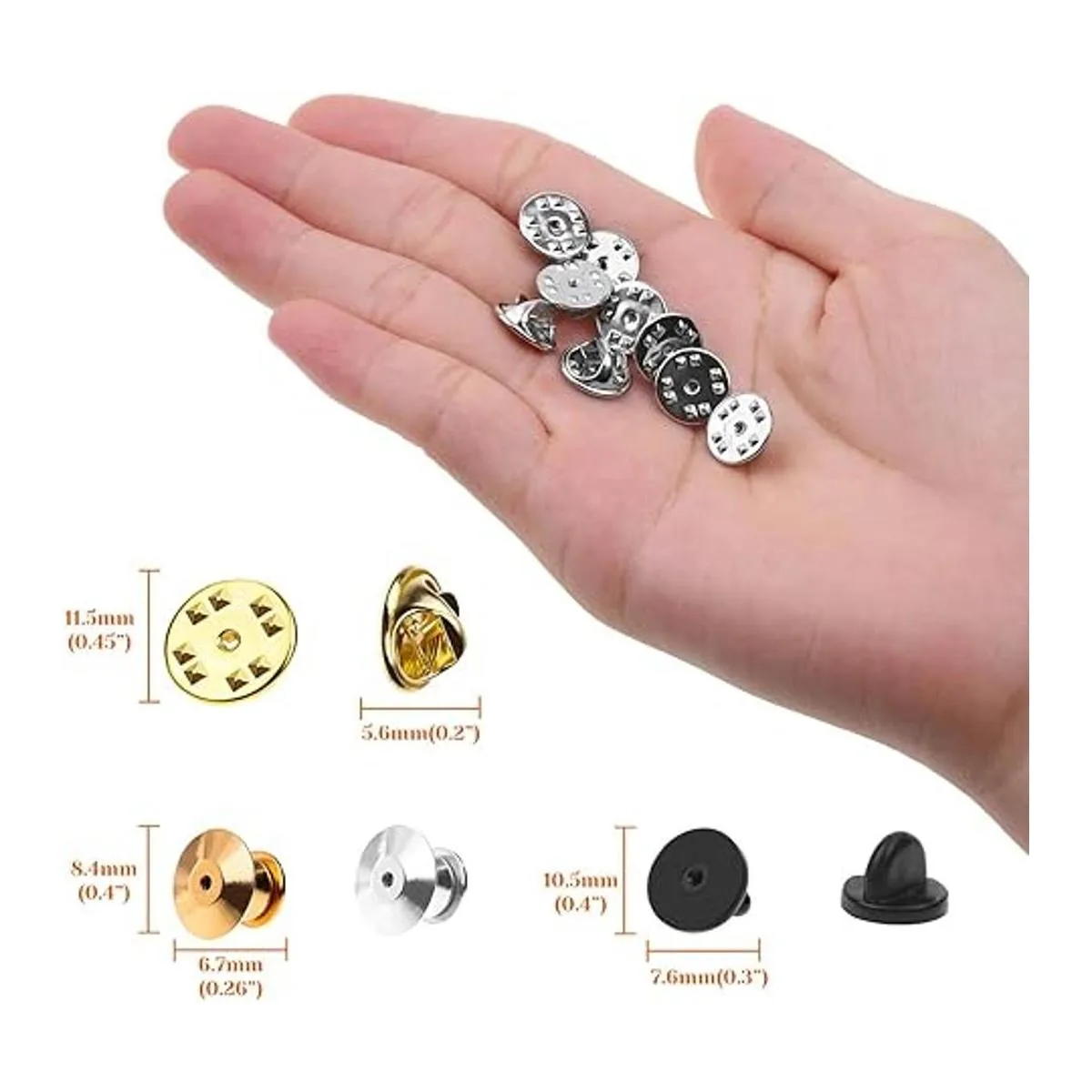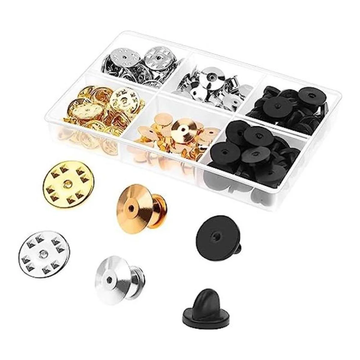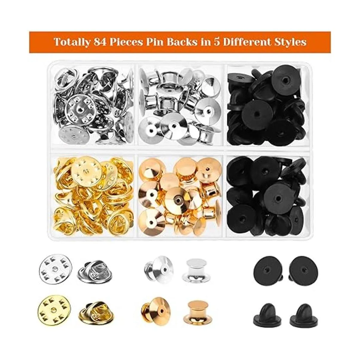 Estilos y colores surtidos: el juego de bloqueo de pines está en 3 estilos diferentes: pasadores de metal, cierres de mariposa de metal y cierres de goma. Los cierres de bloqueo de pin de metal son de colores dorado y plateado, mientras que los cierres de goma son de color negro. Te proporciona una buena selección para adaptarse a tus diferentes necesidades