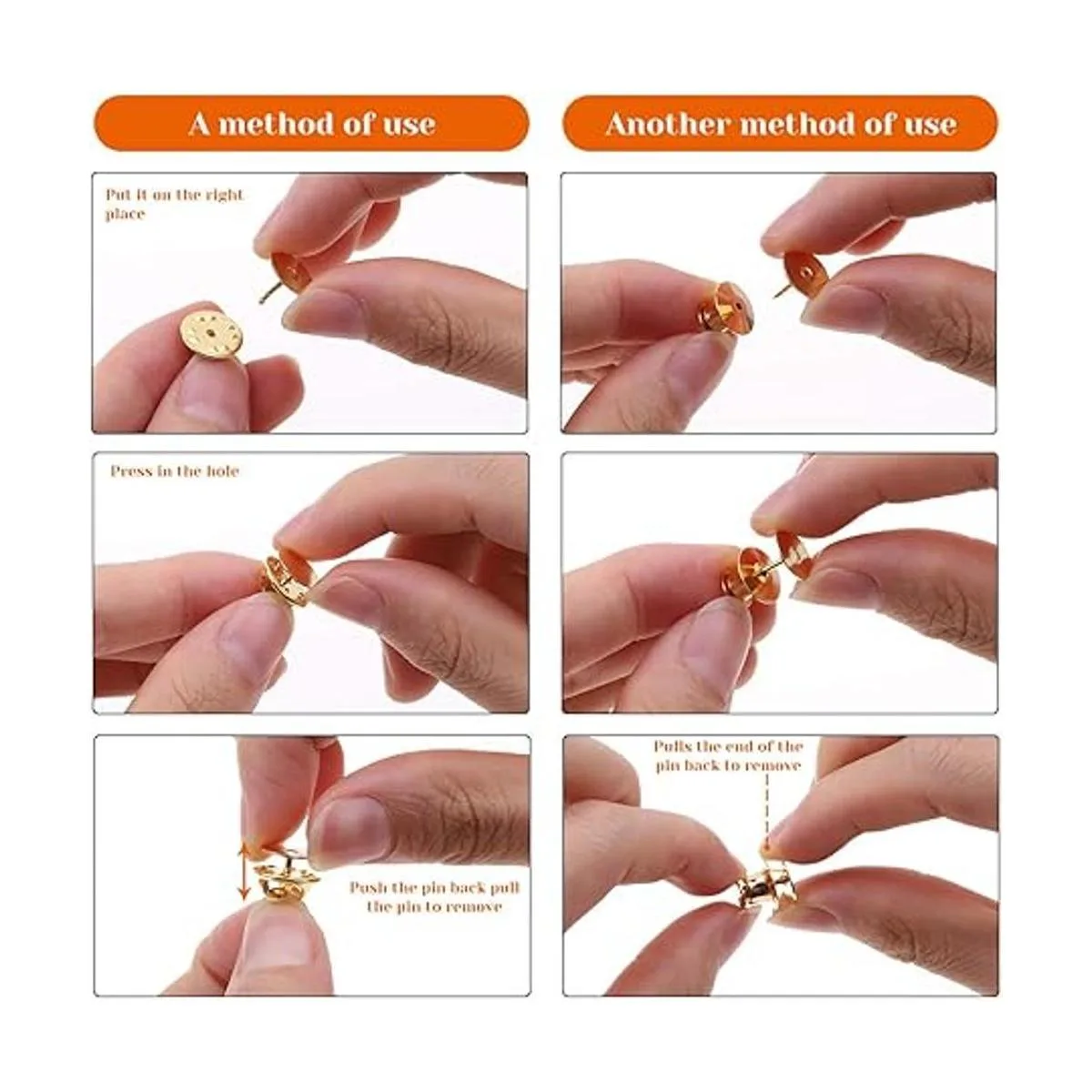 Fácil de instalar y quitar: estos pines de solapa son fáciles de poner y quitar sin necesidad de herramientas. Para los pasadores de metal, simplemente tira hacia arriba del pin esmaltado hacia atrás para asegurar y quitar. Para el pasador de embrague de mariposa, empuja el gatillo para asegurar y liberar