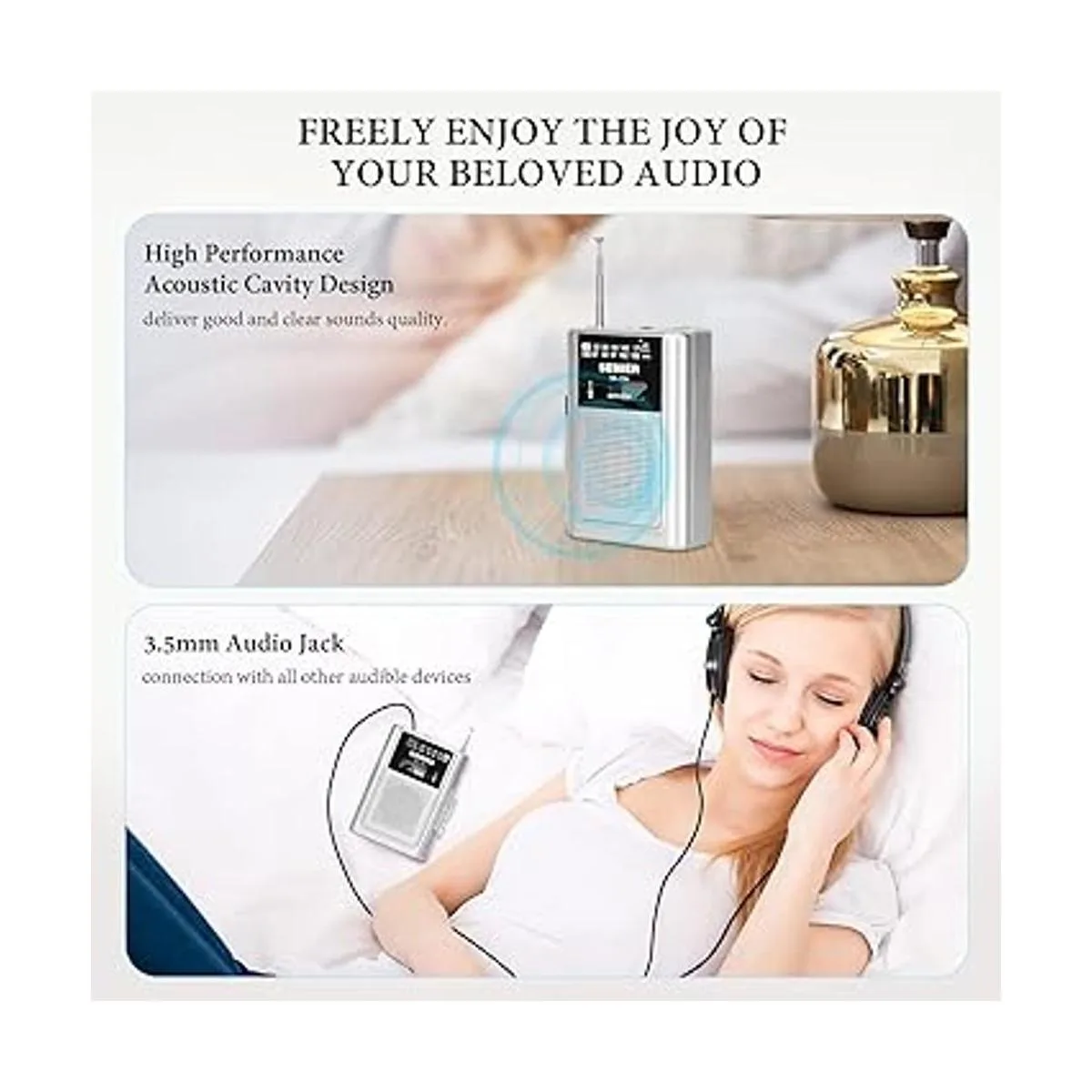 Radio AM/FM de recepción de alta sensibilidad Fuerte recepción con radio AM FM como música clásica, juego de béisbol, estación de noticias…. La antena larga fortalecerá la señal AM/FM en algún lugar con recepción débil.