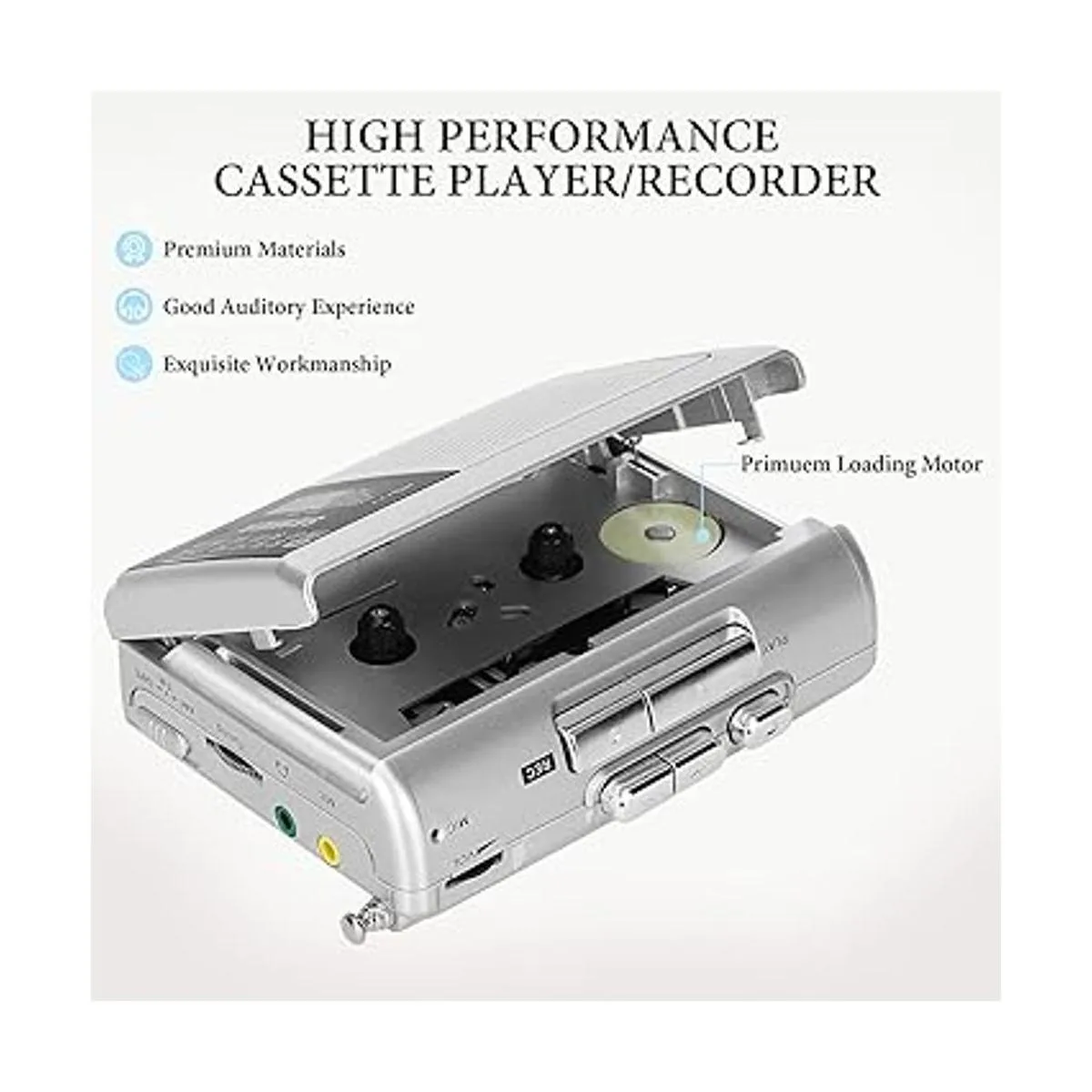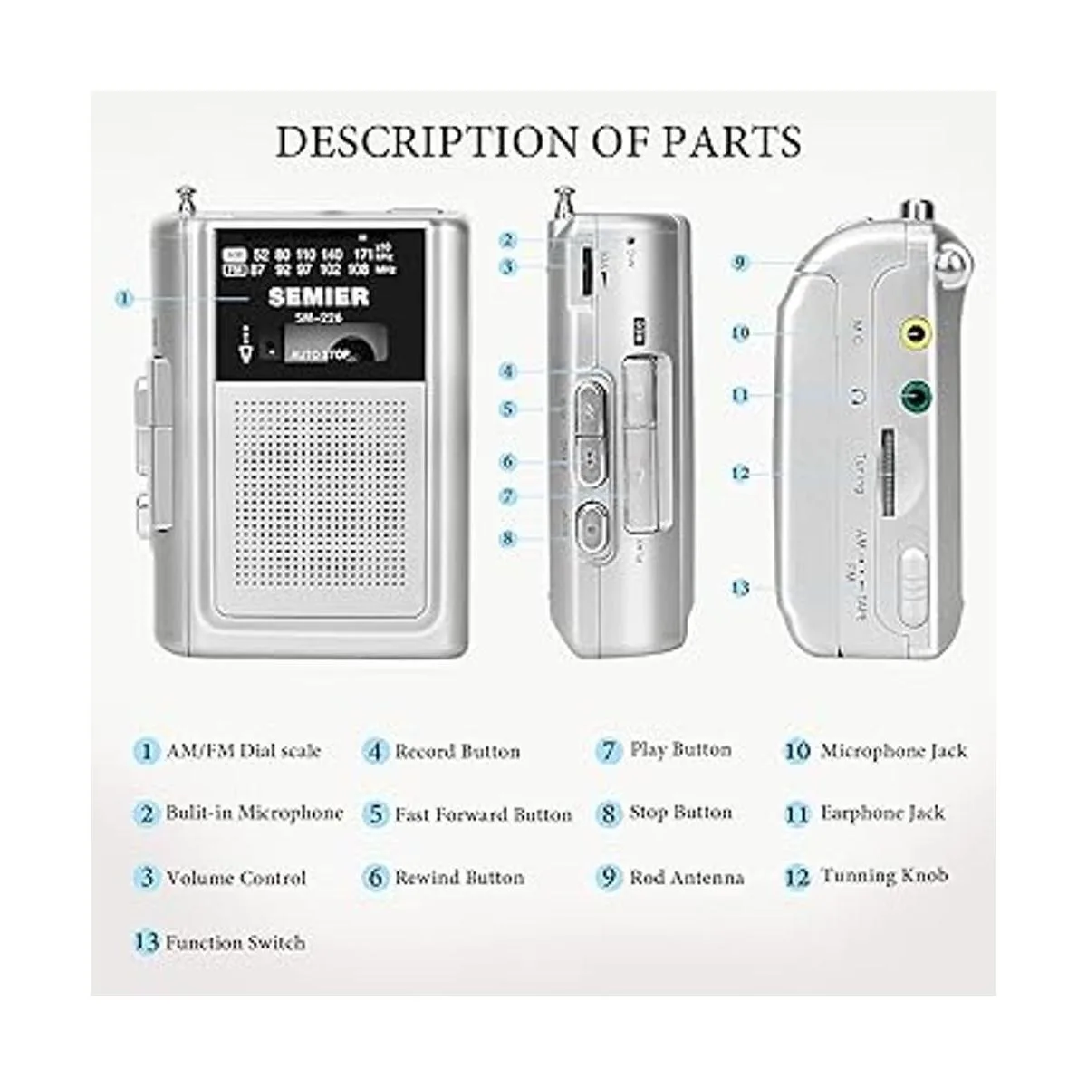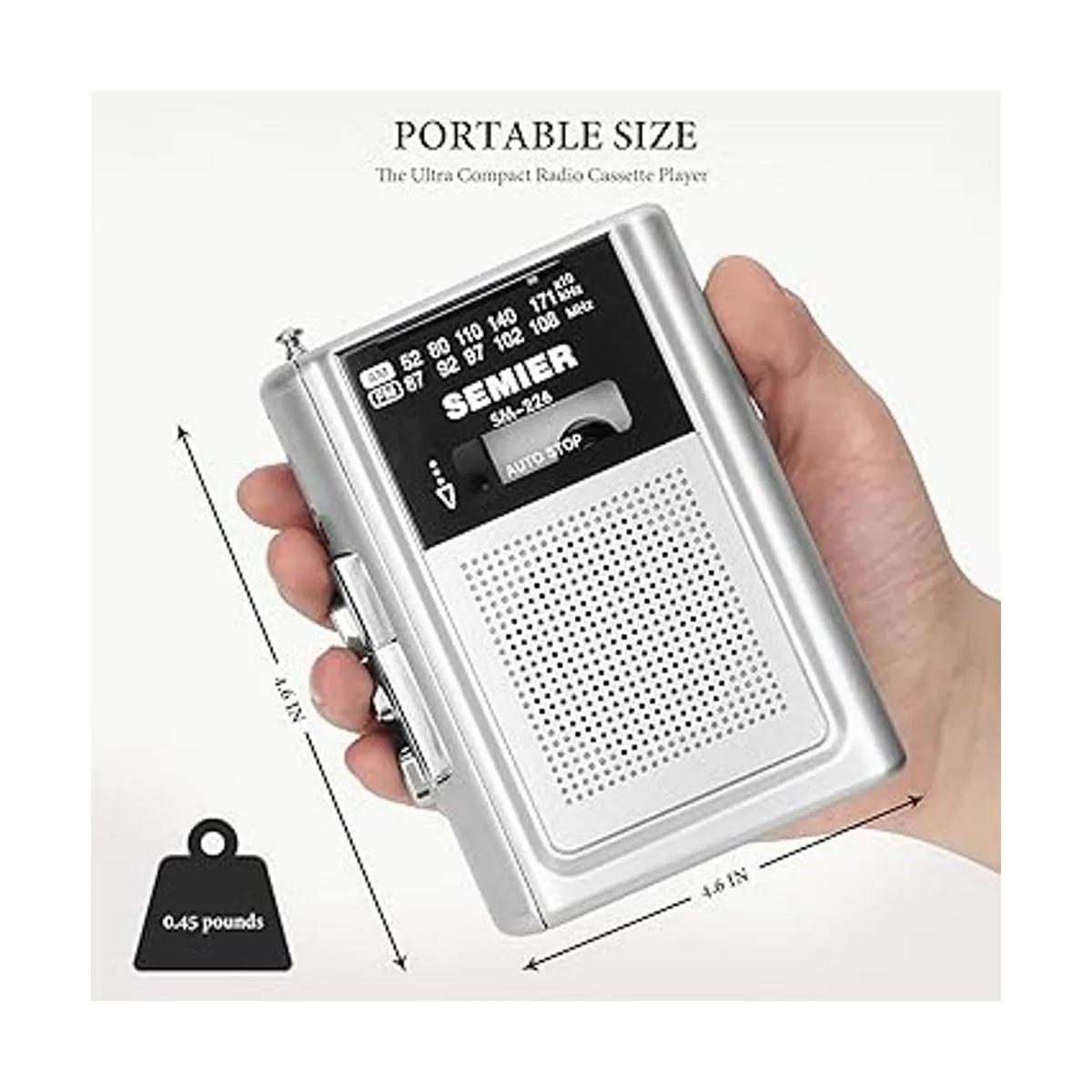 SEMIER Reproductor de casete portátil AM FM Radio estéreo Reproductor de cinta de casete personal compacto Walkman con altavoz integrado y auriculares, color plateado
