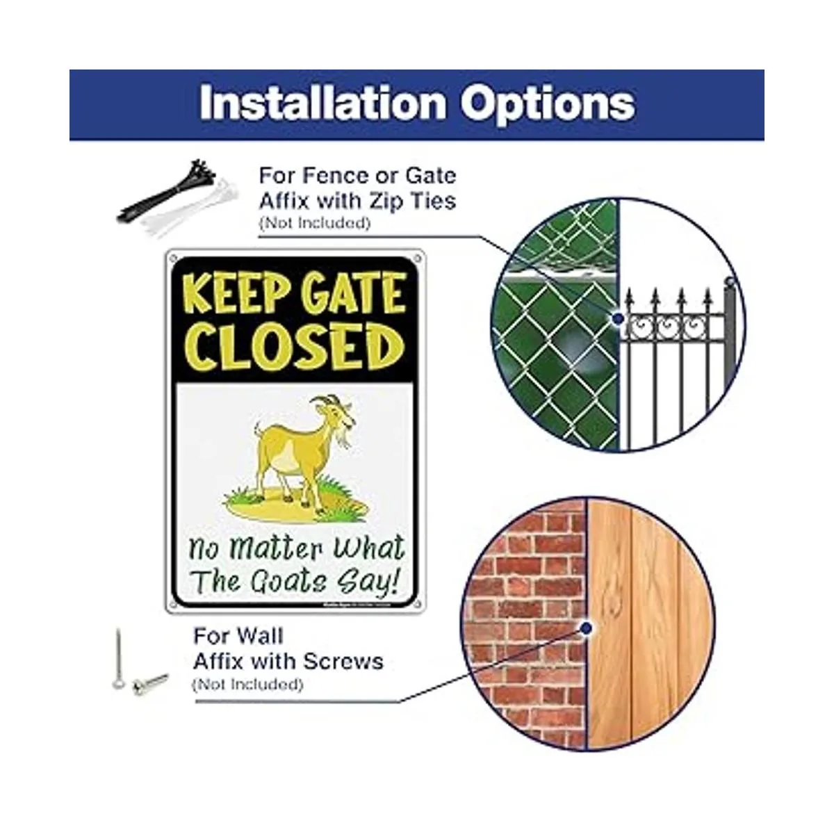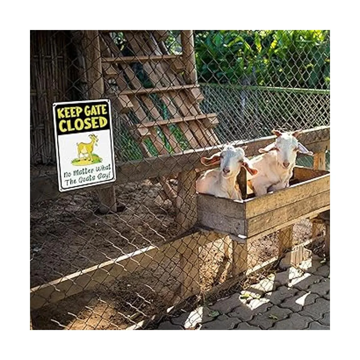 Fácil de leer: letrero de metal con texto en inglés Keep Gate Closed Sign No Matter What The Goats Day, mide 14.0 x 10.0 in, los colores son rados y notables, impreso con letras grandes que son visibles para leer desde distancia.