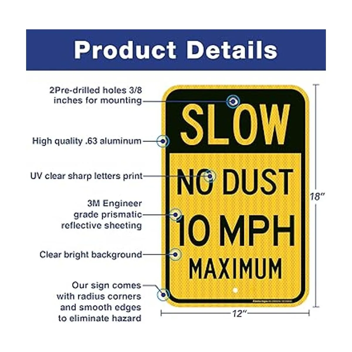 Señal de límite de velocidad lento sin polvo, 10 MPH, 18 x 12 pulgadas, lámina reflectante de grado ingeniero, aluminio libre de óxido, resistente a la intemperie, impermeable, tinta duradera, fácil de montar