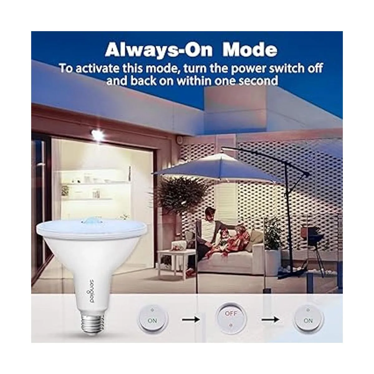 Encendido o apagado automático y modo siempre encendido: bombillas con sensor de movimiento con sensor de fotocélula integrado, que permite que la bombilla permanezca apagada durante el día y se encienda automáticamente cuando se detecta movimiento por la noche. O al girar rápidamente el interruptor de alimentación y volver a encenderlo en un segundo, puedes encender el modo de detección de movimiento al modo siempre encendido. Esto permite que la bombilla LED permanezca encendida en entornos oscuros, al igual que una bombilla ordinaria, independientemente de si se detecta el movimiento. Más conveniente y práctico para uso en interiores y exteriores.