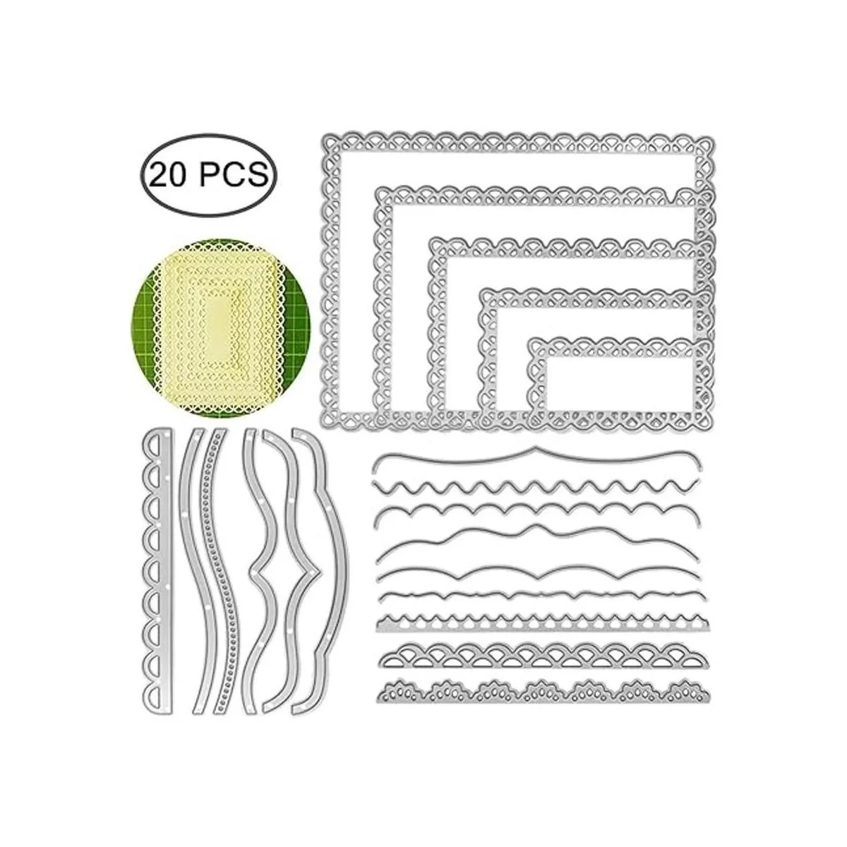 El paquete incluye: 2 juegos de diferentes formas de encaje de papel, 1 juego de forma rectangular, todos satisfacen tus diferentes necesidades de crear manualidades de papel perfectas, tarjetas de celebración.