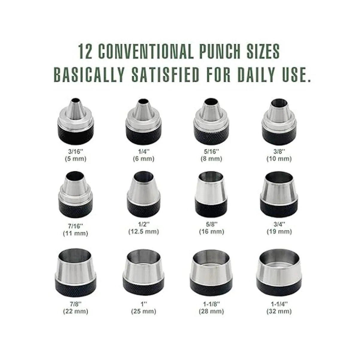 El juego de herramientas de perforación está alojado en una caja de plástico resistente y agradable y consta de un mango con función de centrado y 12 punzones intercambiables. 12 piezas de tamaño de perforación: 3/16, 1/4, 5/16, 3/8, 7/16, 1/2, 5/8, 3/4, 7/8, 1, 11/8, 11/4.
