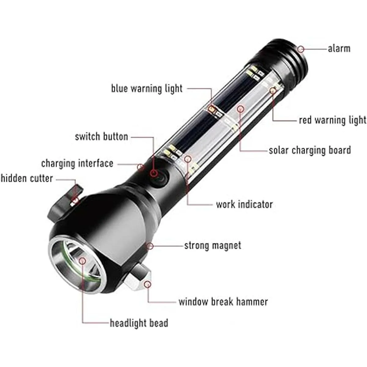 Multifunción Excelente linterna recargable USB/solar dual con 7 modos de trabajo faro alto, medio y estroboscópico, luz lateral blanca: alta y media, modo SOS intermitente rojo y azul alternativamente como una luz de policía. También puede desempeñar el papel de romper ventanas, cortador de cinturón de seguridad, alarma de 120 dB e incluso banco de energía. Una linterna táctica para camping, senderismo o supervivencia al aire libre.