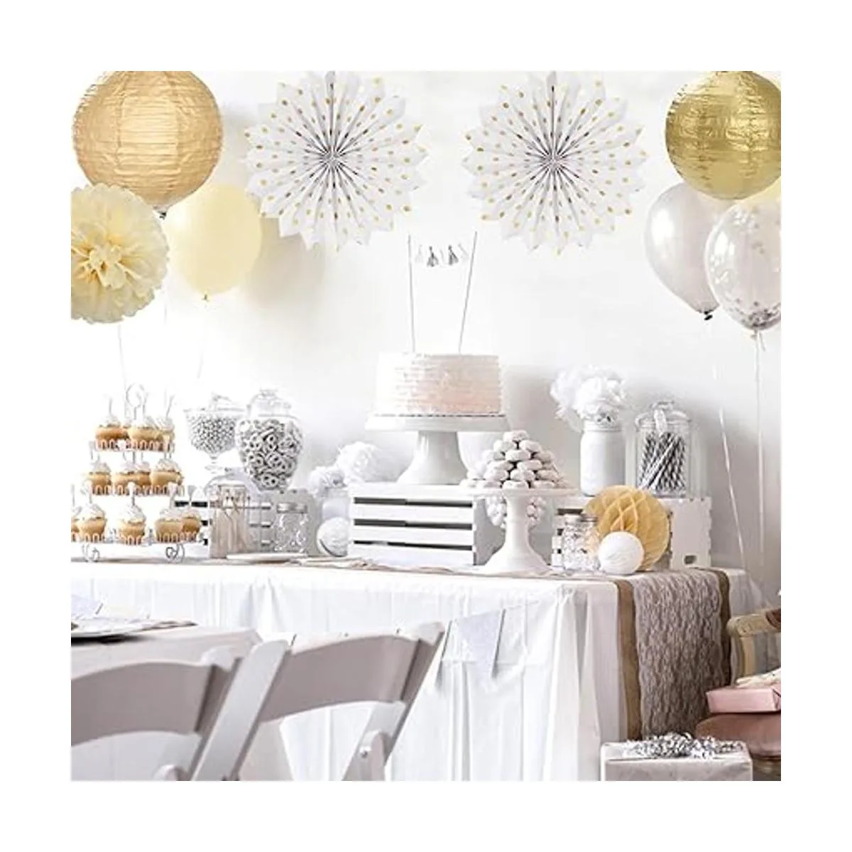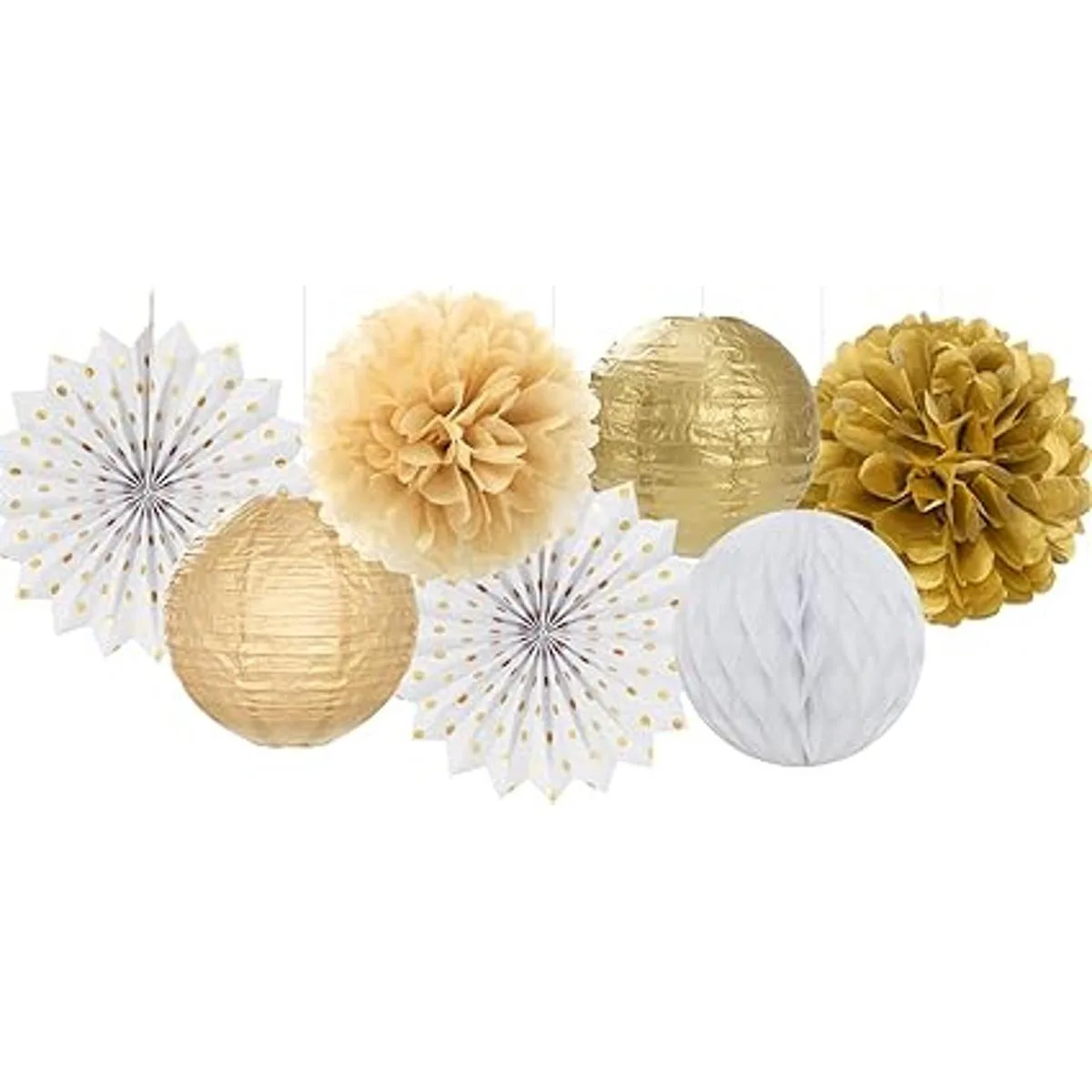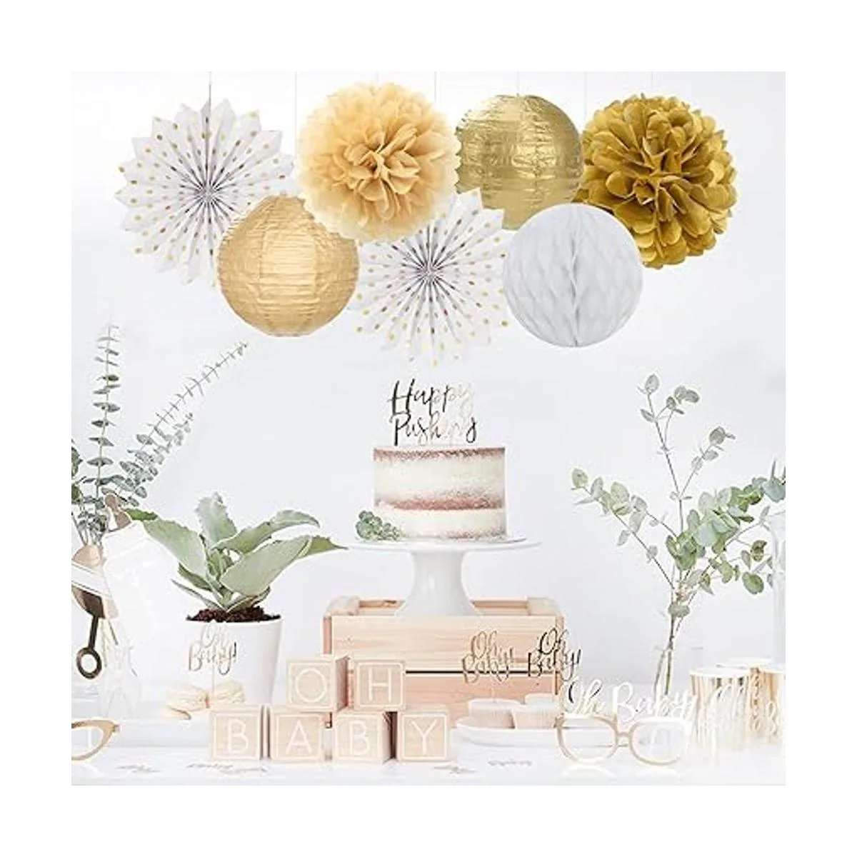 Kits de fiesta de champán de oro blanco: los kits de decoración de fiesta incluyen 6 flores de papel de seda: 3 piezas de 10 pulgadas y 3 piezas de 12 pulgadas en tres colores, 4 bolas de papel de 8 pulgadas, 2 linternas de papel de 8 pulgadas, 2 abanicos de papel de 12 pulgadas.