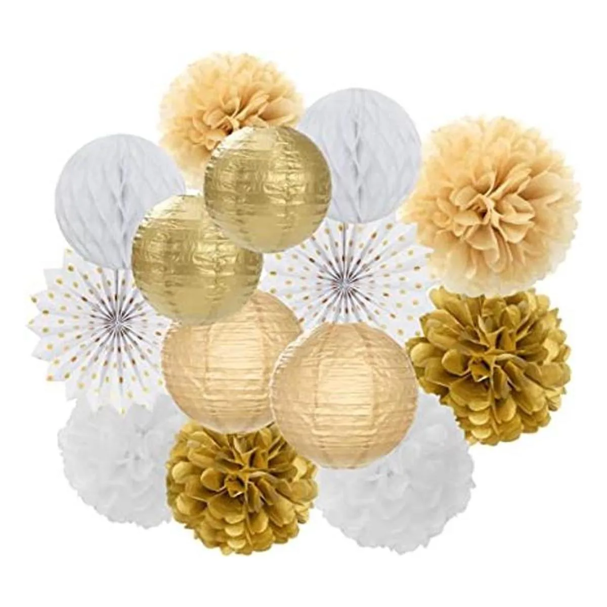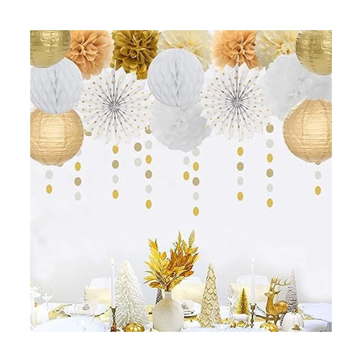 Serpentinas decorativas de fiesta de oro blanco 14 faroles de papel de compromiso de boda, pompones de pañuelo, bolas de panal de abeja, despedida de soltera, cumpleaños, baby shower, decoración duradera sorpresa