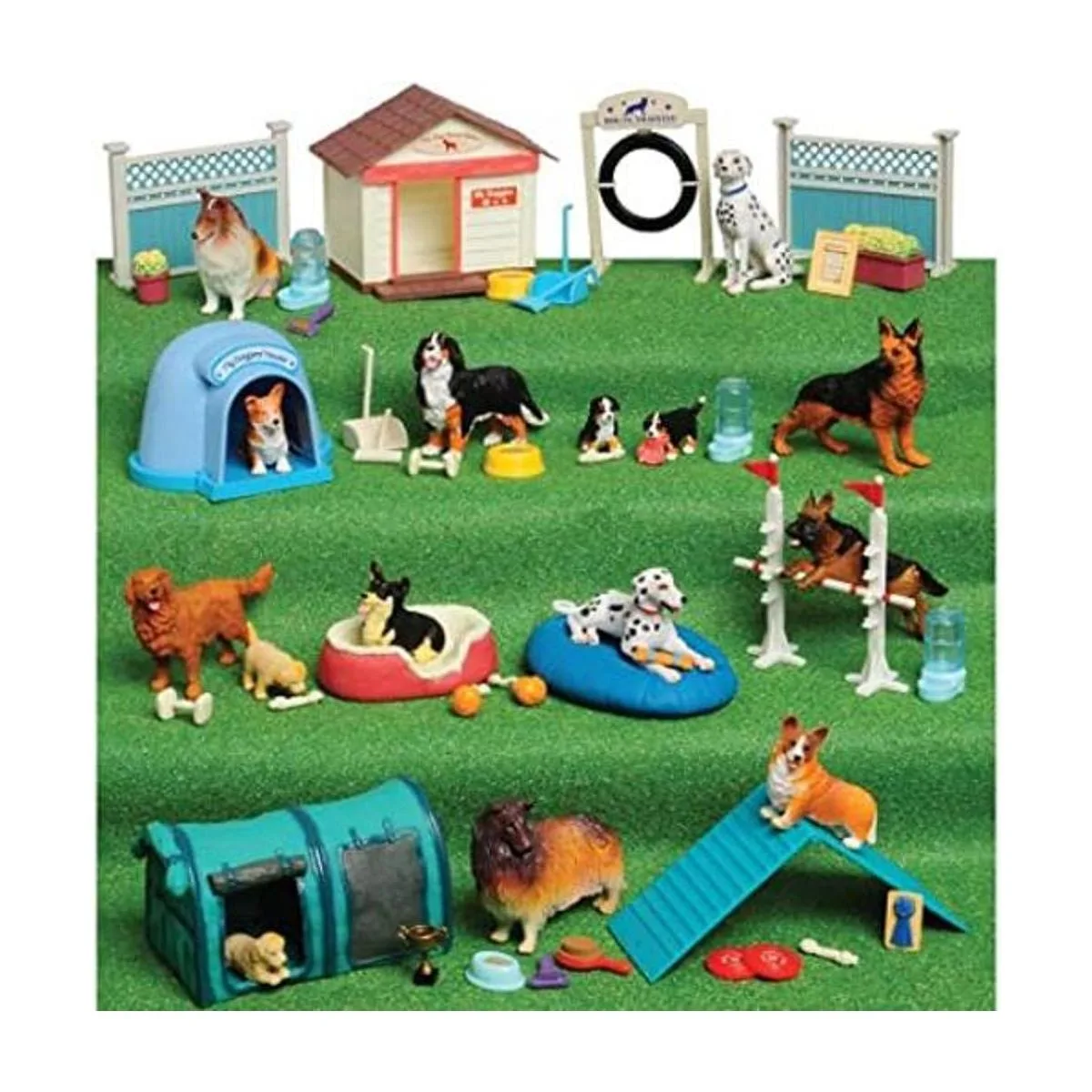 51 piezas realista en todos este juego incluye cepillos para aseo, huesos, premios, camas casas de perro, perro, boles de comida, agua, cuencos, vallas, saltos, plantas, placas, juguetes, y 15 diferentes perros.