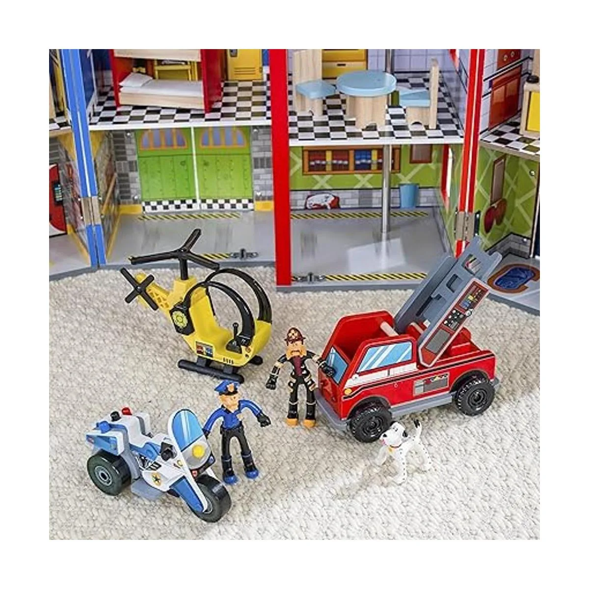3 divertidos vehículos un helicóptero, una moto de policía y un coche de bomberos.