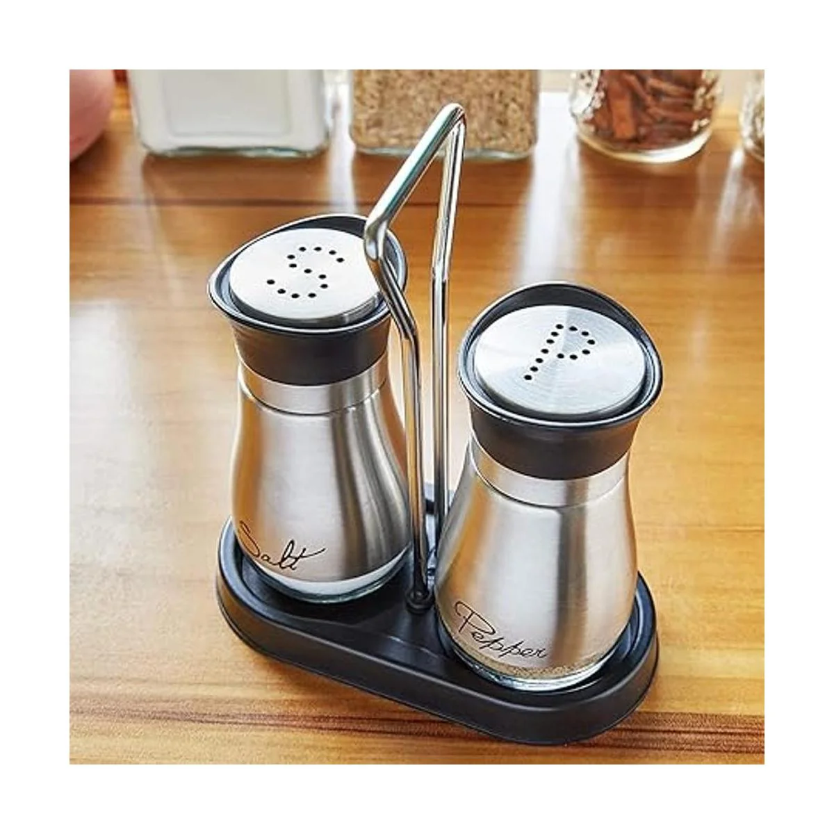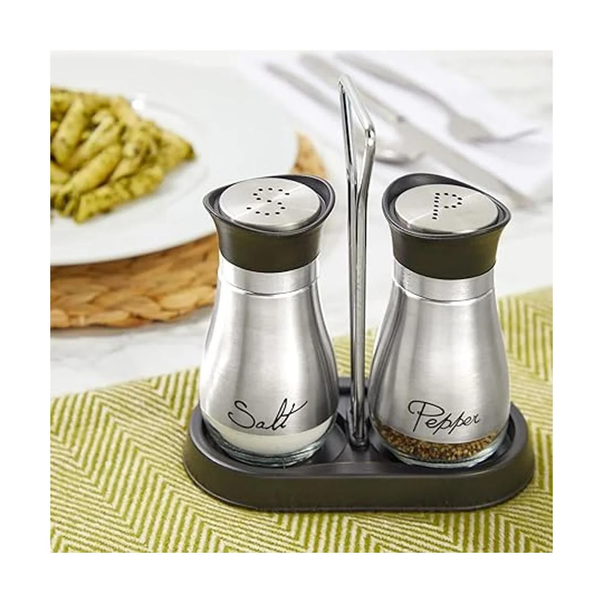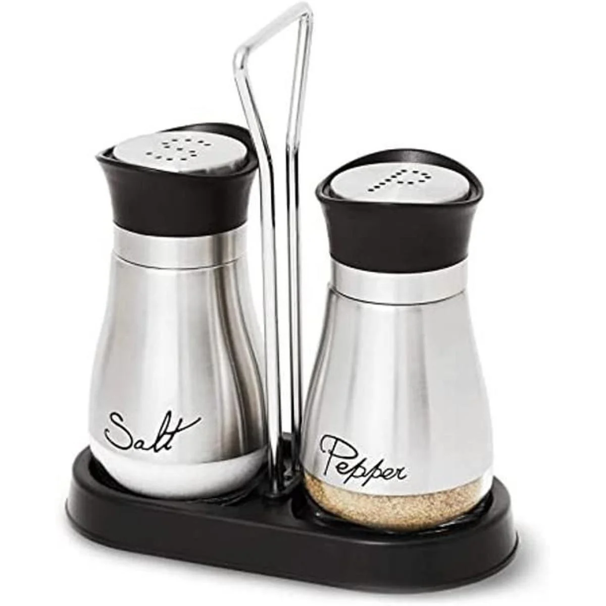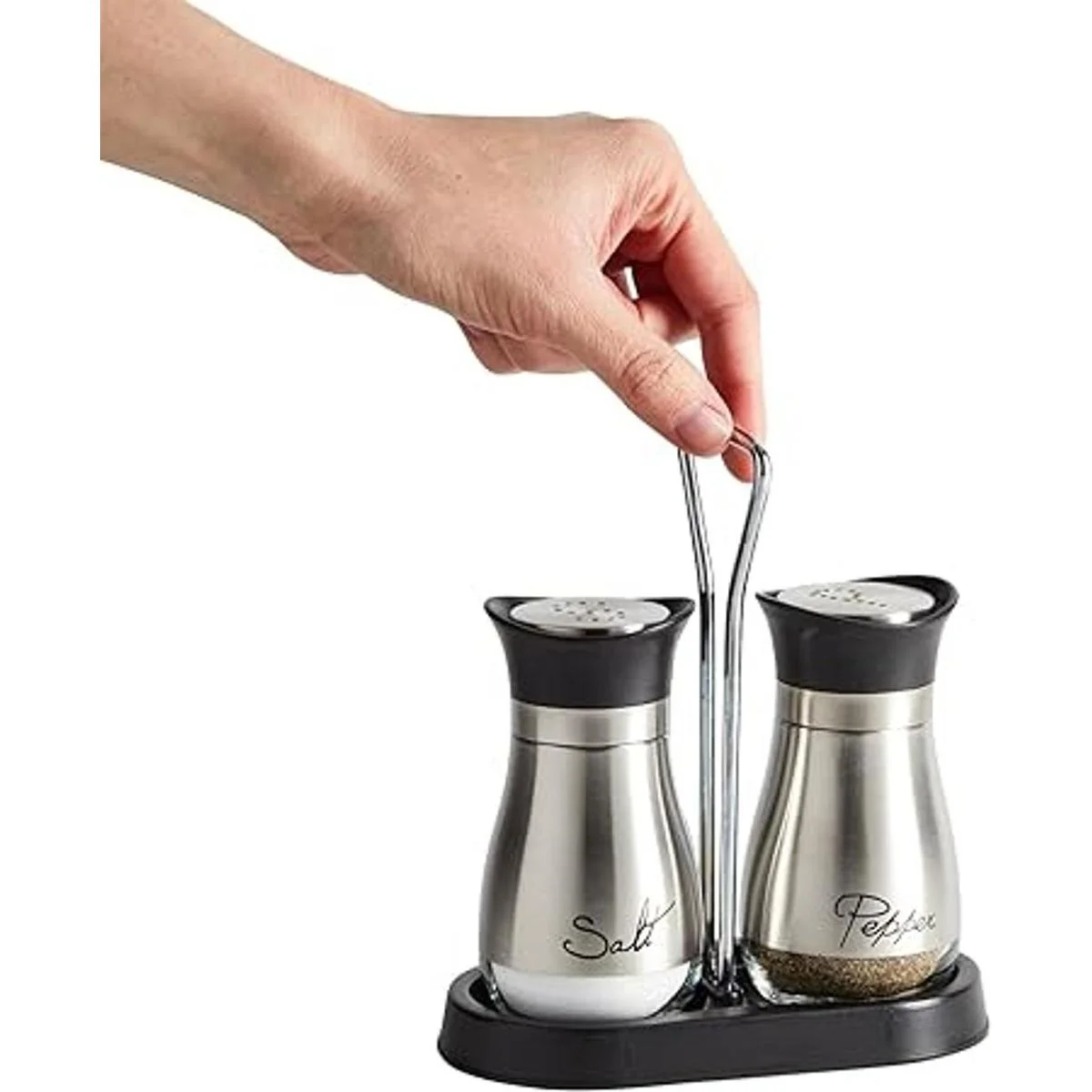Set de salero y pimentero Alto grado de acero inoxidable con fondo de vidrio y 4 pies de altura 4 x 6 x 2 pulgadas 4 onzas.