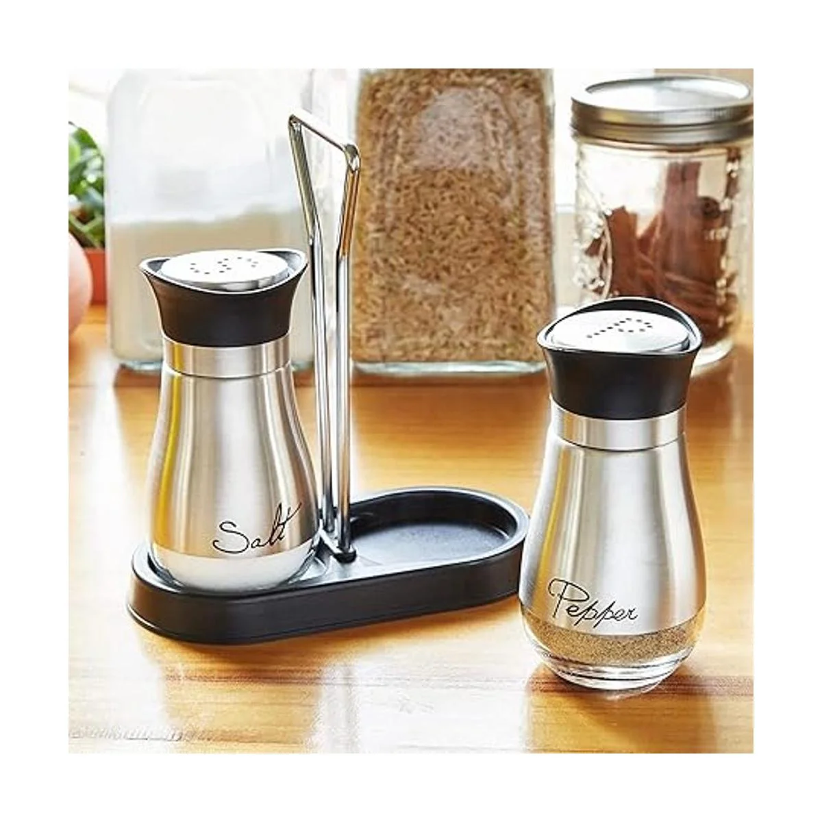 Salero y pimentero de acero inoxidable: nuestros agitadores recargables con un soporte para sal y pimienta están hechos de acero inoxidable de alta calidad y una parte inferior de vidrio que ayuda a verificar cuando los agitadores están bajos