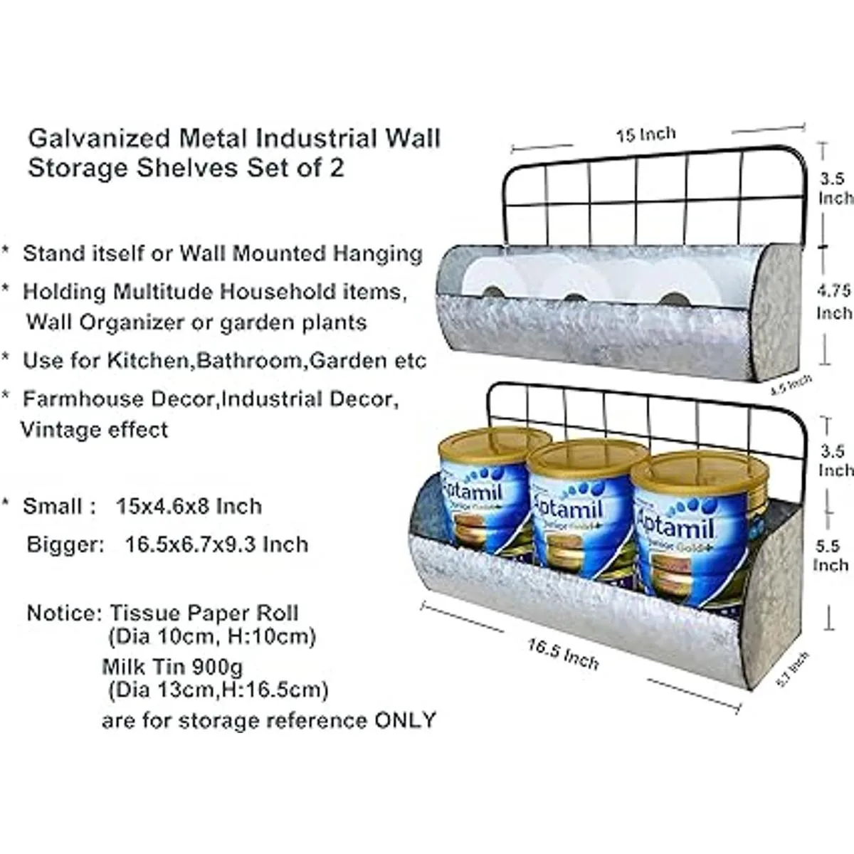 Juego de 2 estantes de pared flotantes decorativos de estaño rústico, práctico contenedor utilizado para guardar una multitud de artículos del hogar, estantes colgantes de lata lo suficientemente anchos como para tener toallas de mano, sostener papel higiénico, o incluso un tarro de albañilería, multiusos para baño organizador de almacenamiento de pared de baño, cocina soporte de almacenamiento de cocina o estantes de almacenamiento de pared de cocina y comedor estantes de almacenamiento de pared, etc. Aspecto industrial con estantes profundos que puede plantar para un jardín de hierbas también maceta de flores de jardín