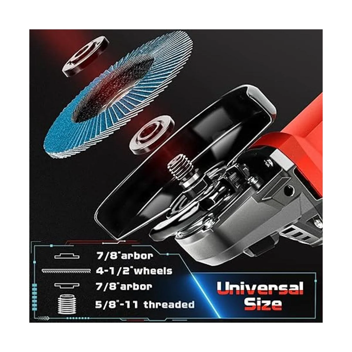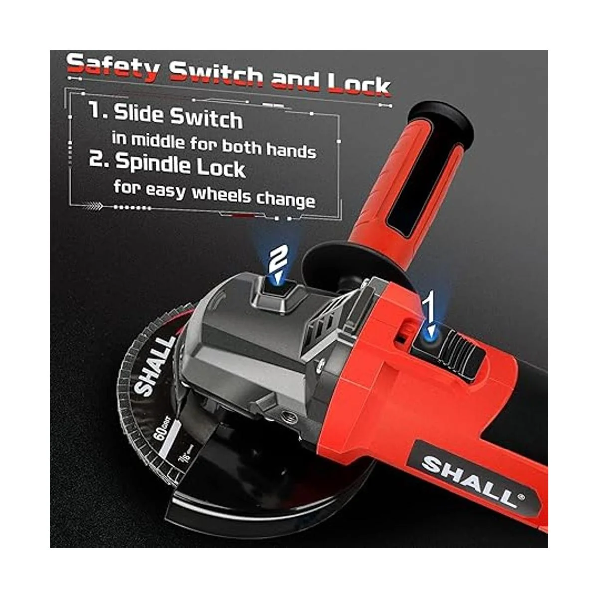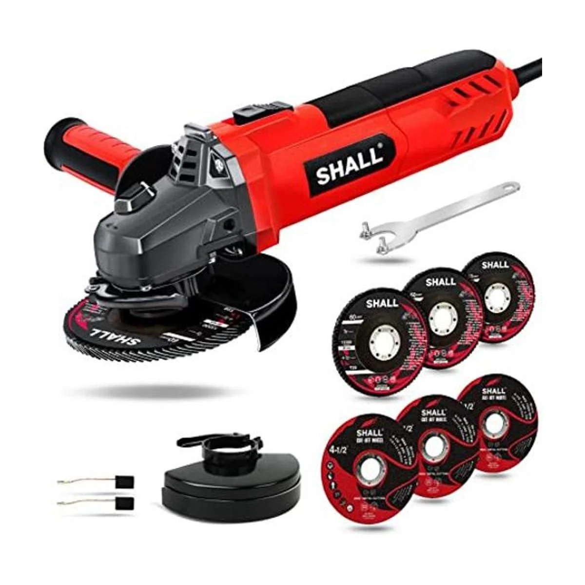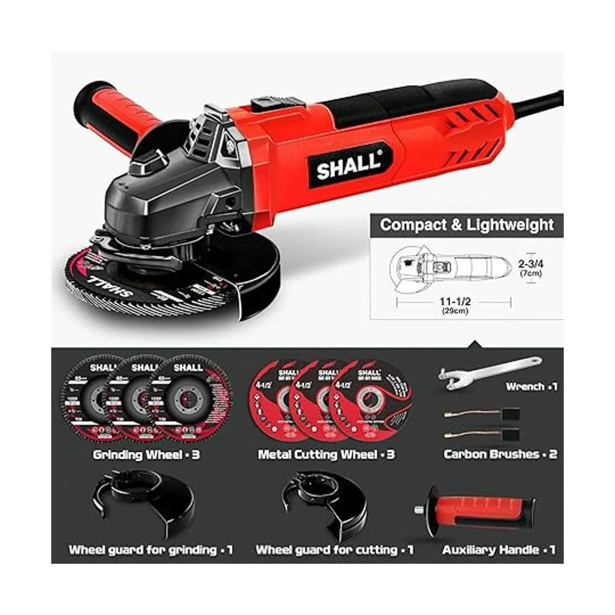 SHALL Herramienta de amoladora angular de 7.5 amperios, herramientas eléctricas, amoladora eléctrica de metal de 12000 revoluciones por minuto con 2 protectores de seguridad, 3 ruedas de corte, 3 discos de solapa, mango antideslizante y cepillo de carbono para metal, madera