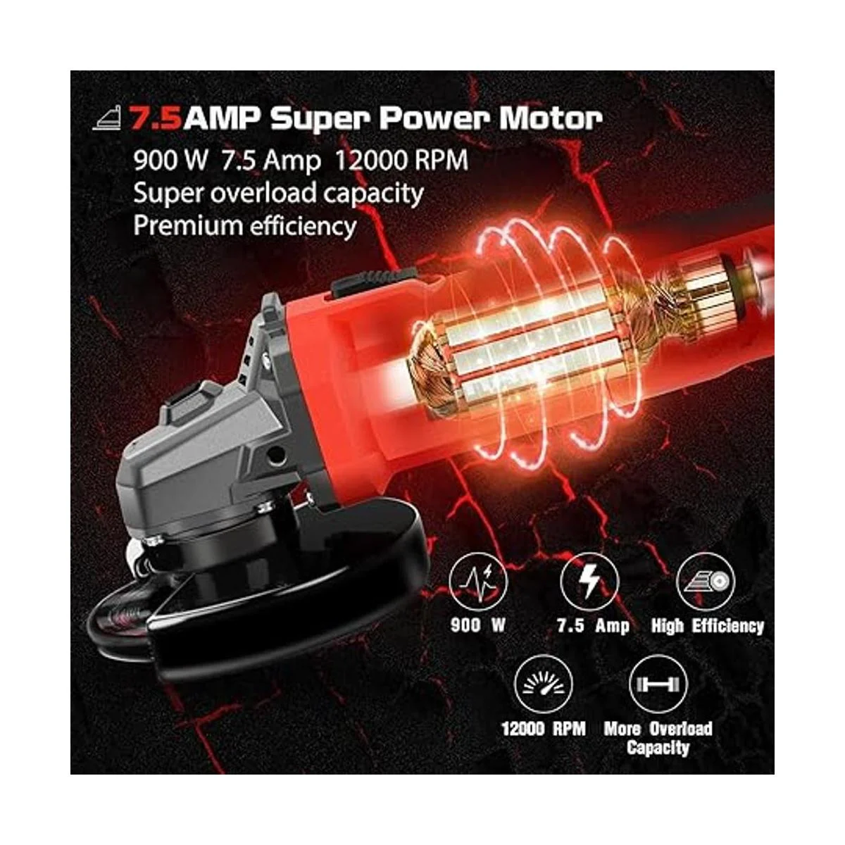 Súper potencia Equipado con un motor de 7.5 amperios junto con una salida de potencia máxima de 900 W, la salida de potencia única de esta amoladora angular de 41/2 puede producir una velocidad sin carga de 12000 RPM, lo que le da una capacidad de corte y molienda rápida