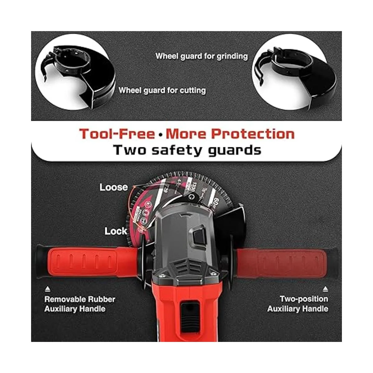 Diseño de seguridad y comodidad Viene con 2 tipos diferentes de protectores de rueda sin herramientas específicamente diseñados para proteger a los usuarios durante el corte y la molienda. Además, el interruptor deslizante tiene una función de bloqueo/encendido para un fácil funcionamiento y el bloqueo del eje elevado hace que sea fácil y seguro cambiar sus accesorios