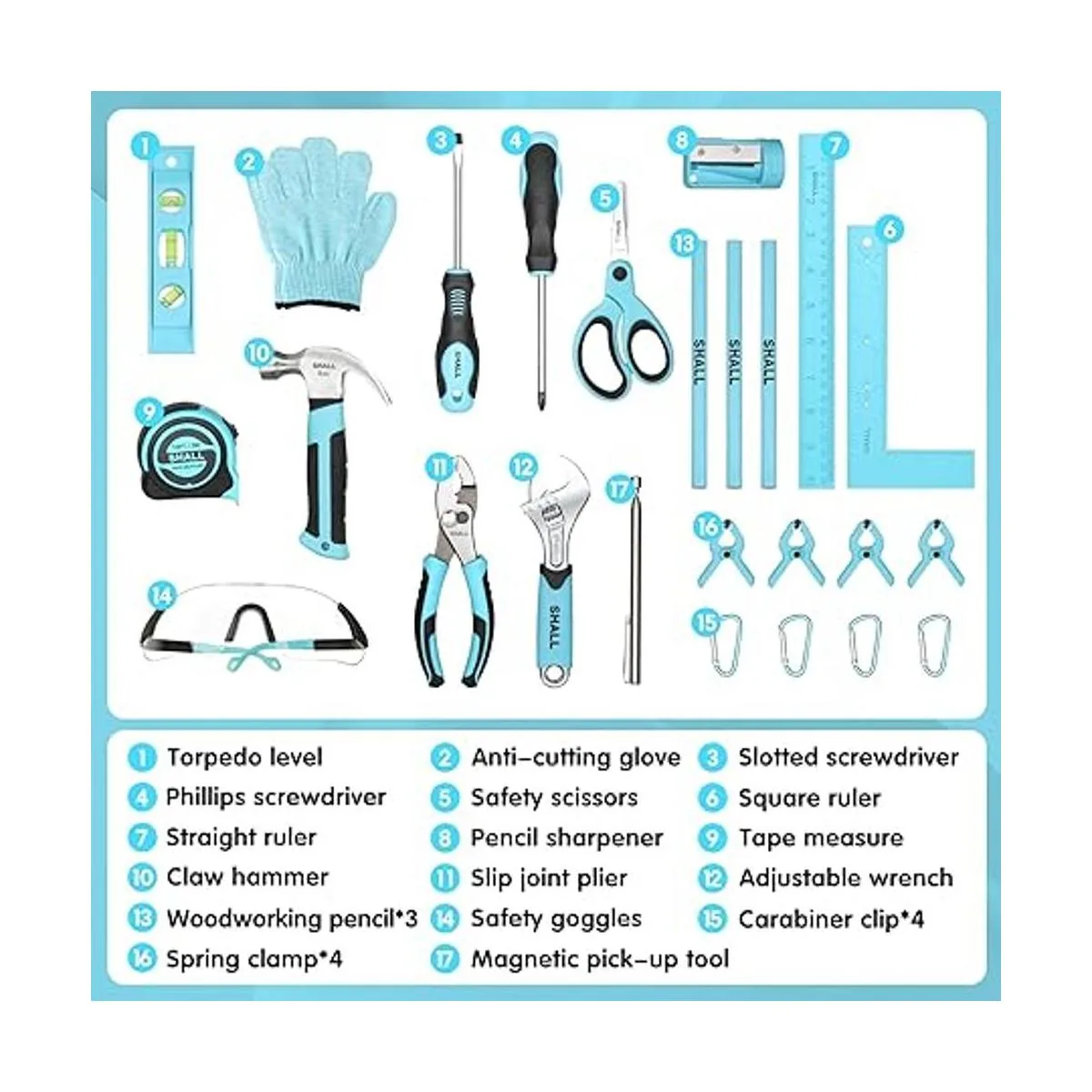 Lo que obtienes: este juego de herramientas de metal para niños real hace que sea divertido para los niños explorar y aprender. Alicates de junta deslizante, llave ajustable, tijeras de seguridad, cinta métrica, gafas de seguridad, juego de destornilladores, martillo de garra rechoncho, nivel de torpedo, clip de mosquetón, abrazadera de resorte, herramienta de recogida, lápices y sacapuntas de carpintería, reglas, guantes anticorte y bolsa de herramientas.