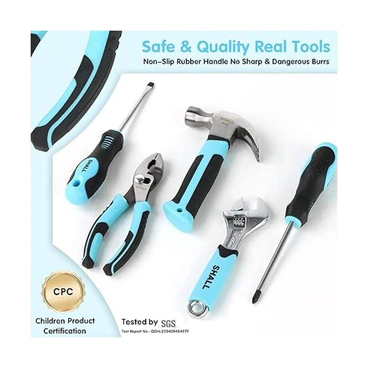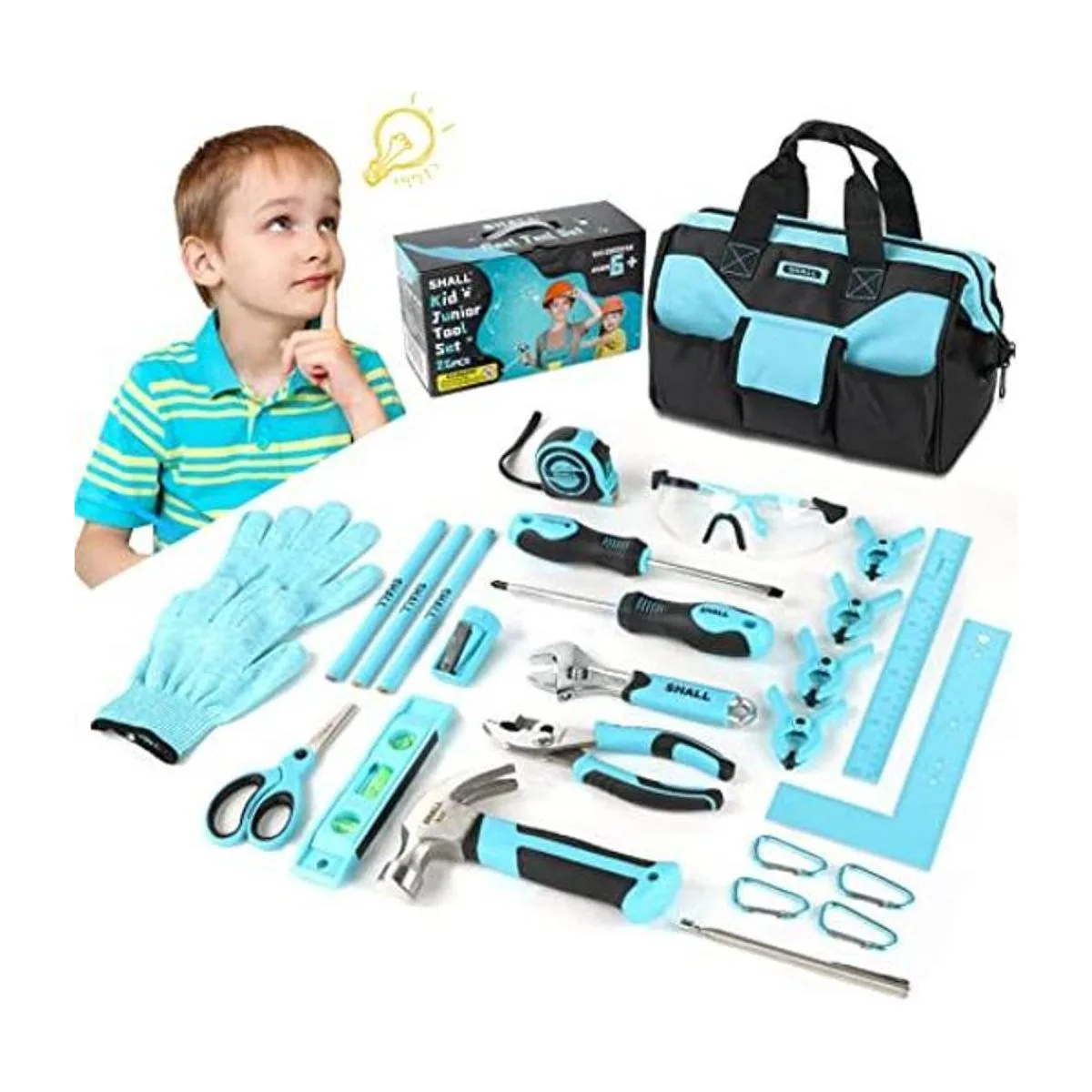 SHALL Juego de herramientas de 26 piezas para niños, kit de herramientas reales para niños con bolsa de herramientas de 12 pulgadas, juego de herramientas de aprendizaje para niños y niñas a partir de 6 años, construcción de bricolaje, carpintería y construcción