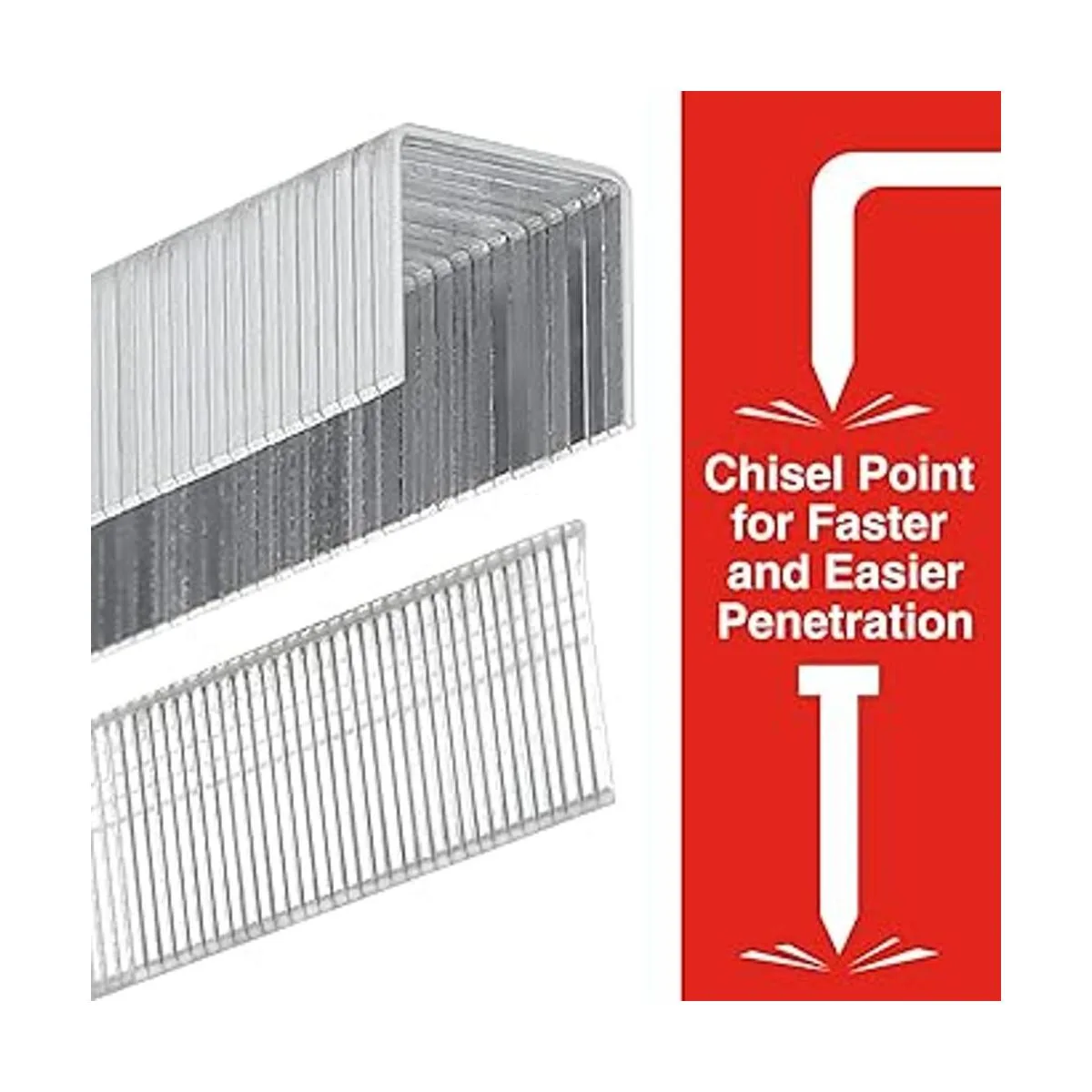 Punta de cincel afilada: diseñada para introducir las grapas/clavos en objetos con menos atascos, hebillas e interrupciones. Penetra fácil y rápidamente a través de muchos materiales diferentes