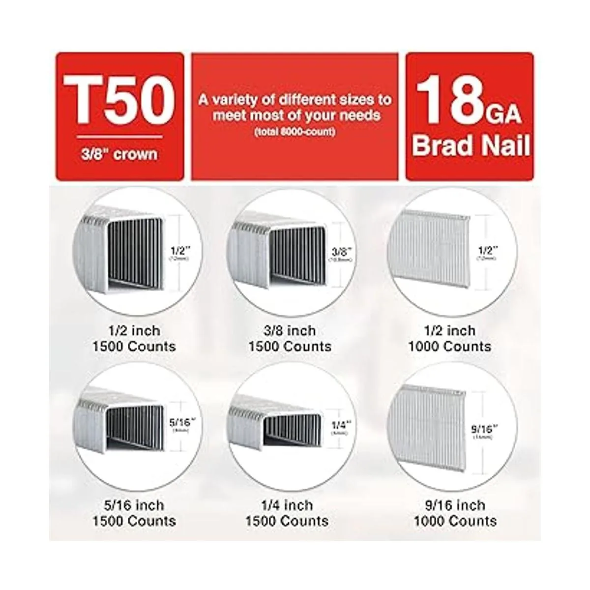 Tamaño universal: las grapas T50 estándar de longitud de corona de 3/8 pulgadas y clavos de calibre 18 son generalmente adecuadas para la mayoría de s de grapas manuales/eléctricas/neumáticas que aceptan grapas T50 de 1/4 a 1/2 pulgada y clavos de calibre 18 de 1/2 a 9/16.