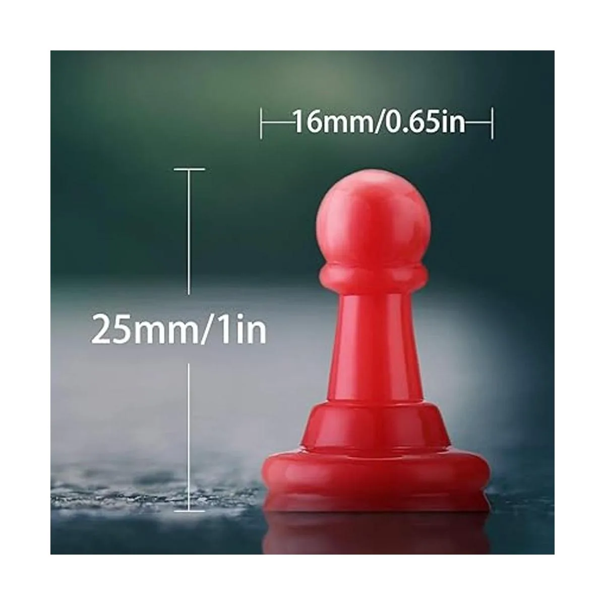 8 colores: rojo, amarillo, naranja, verde, azul, morado, blanco, negro; cada pieza de peón mide 1 pulgada de alto y 0.65 pulgadas de ancho en la base
