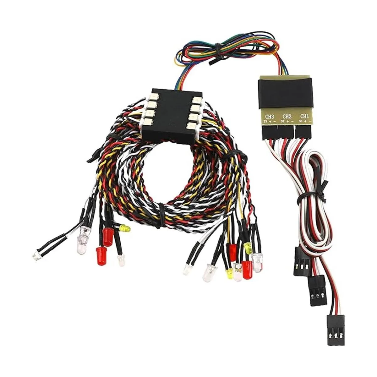 Requerido: cable de arnés JR Y no incluido. Voltaje de funcionamiento: 5 V 7 V, potencia: 0.1 W, utiliza el receptor como fuente de alimentación. El canal CH1 para la luz de señal de giro, el canal CH2 para la luz trasera y la luz trasera, juego de luces de señal de freno; canal CH3 para faros antiniebla
