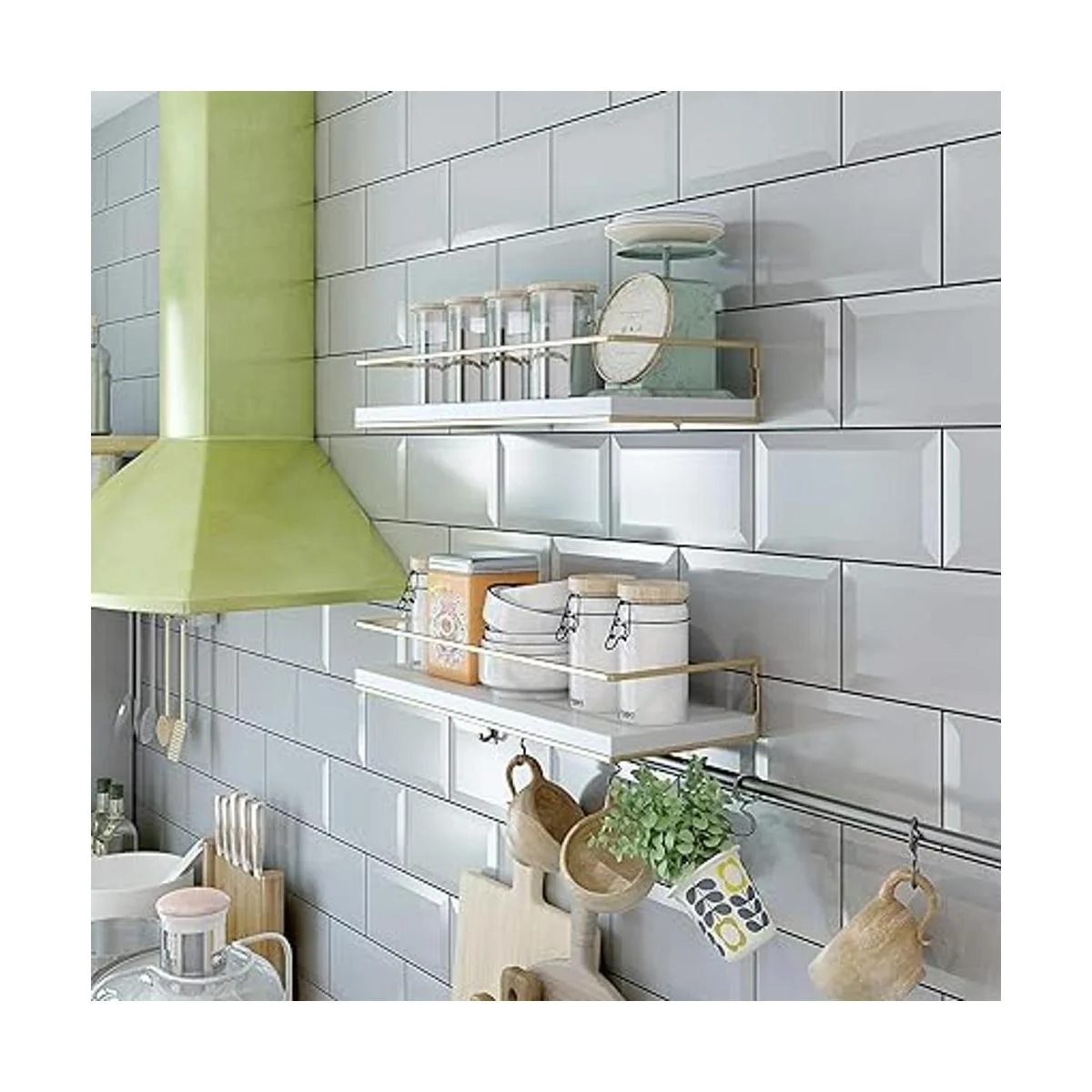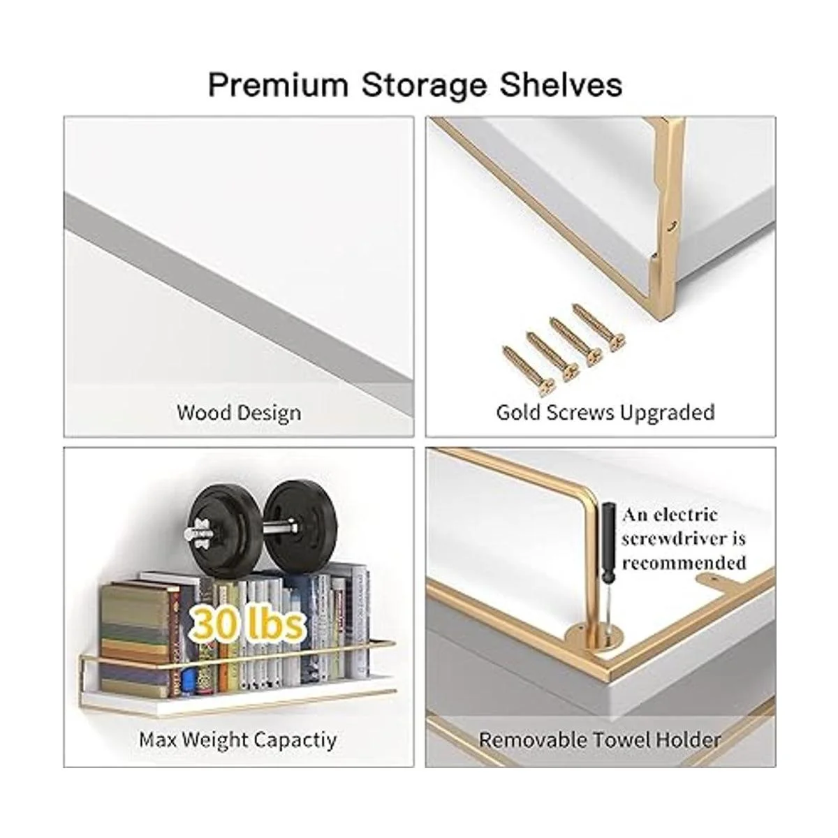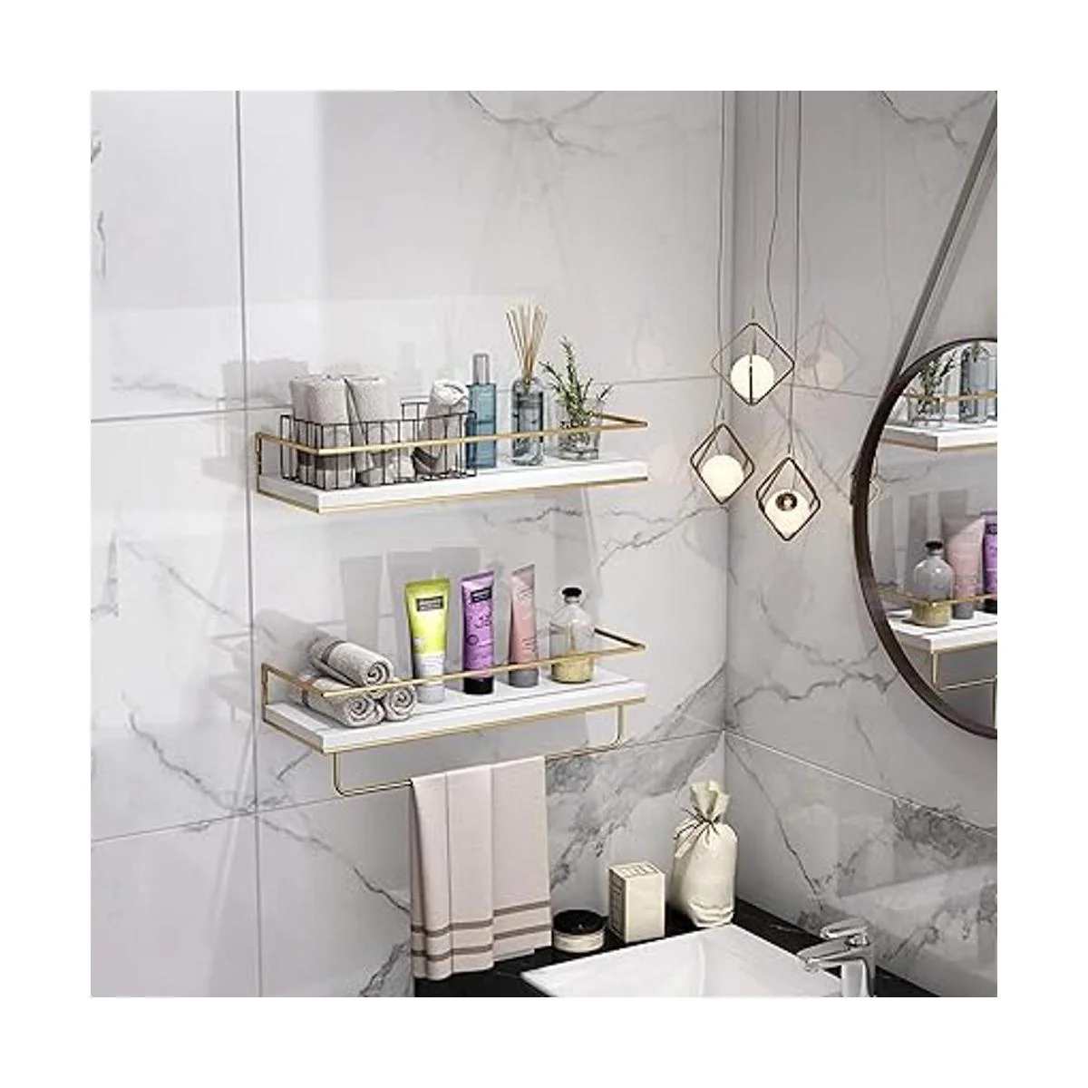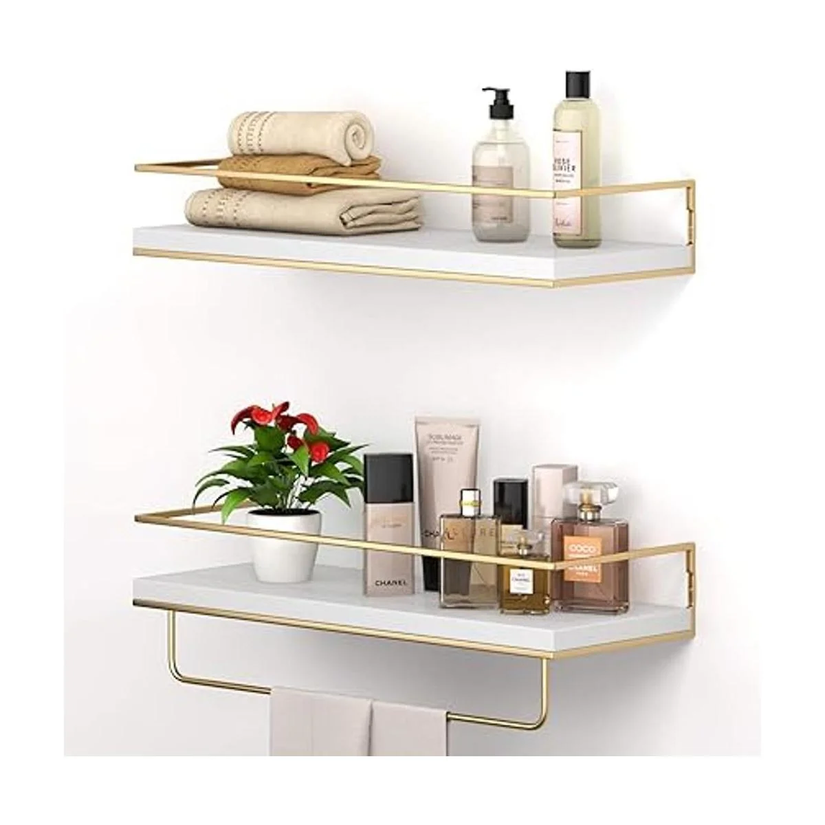 Shario Estantes flotantes blancos, juego de 2, estantes colgantes de pared con toallero dorado, estantes de almacenamiento decorativos para baño, cocina, sala de estar y dormitorio blanco