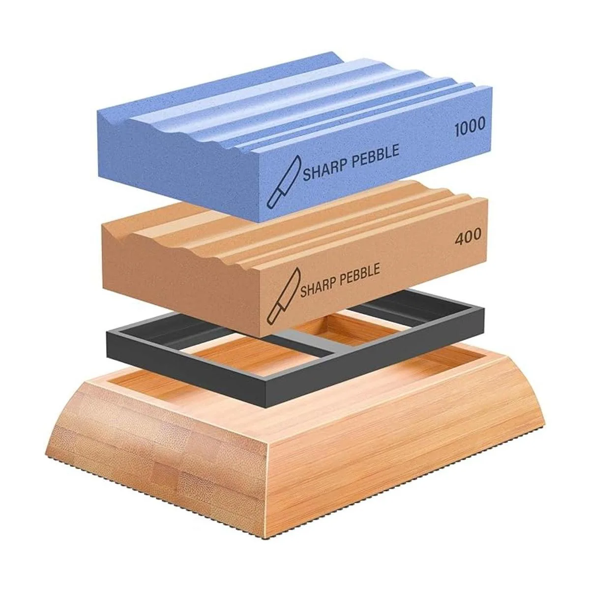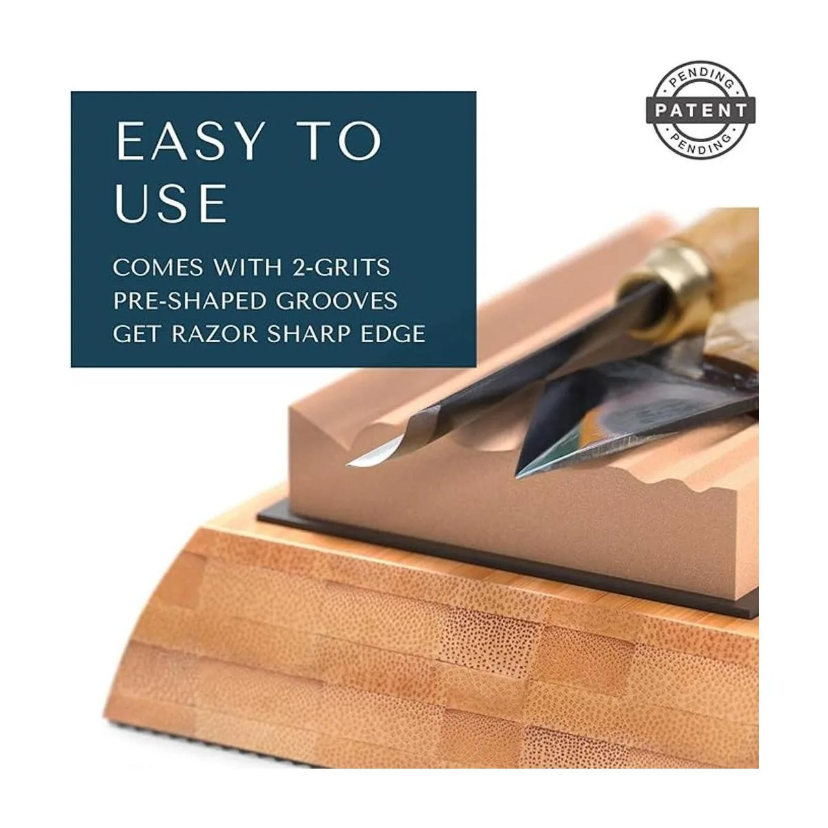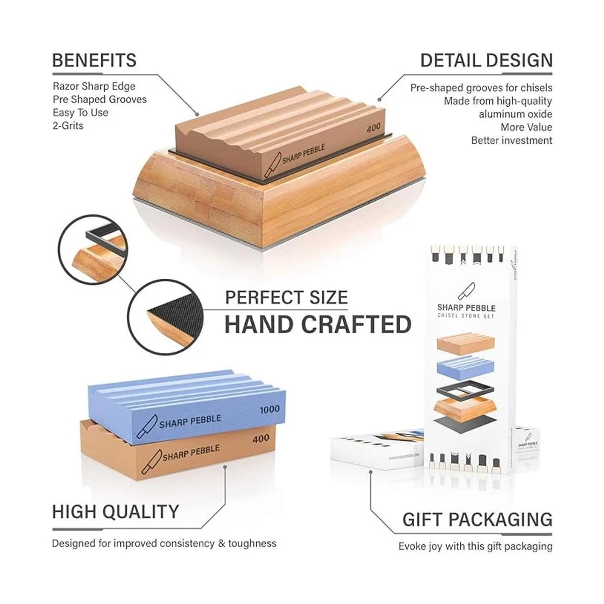 Sharp Pebble Piedras de afilar para herramientas de tallado de madera, dos afiladores de grano 400 y 1000, sistema de afilado de piedra de agua para cuchillos y cinceles de madera con base de bambú antideslizante