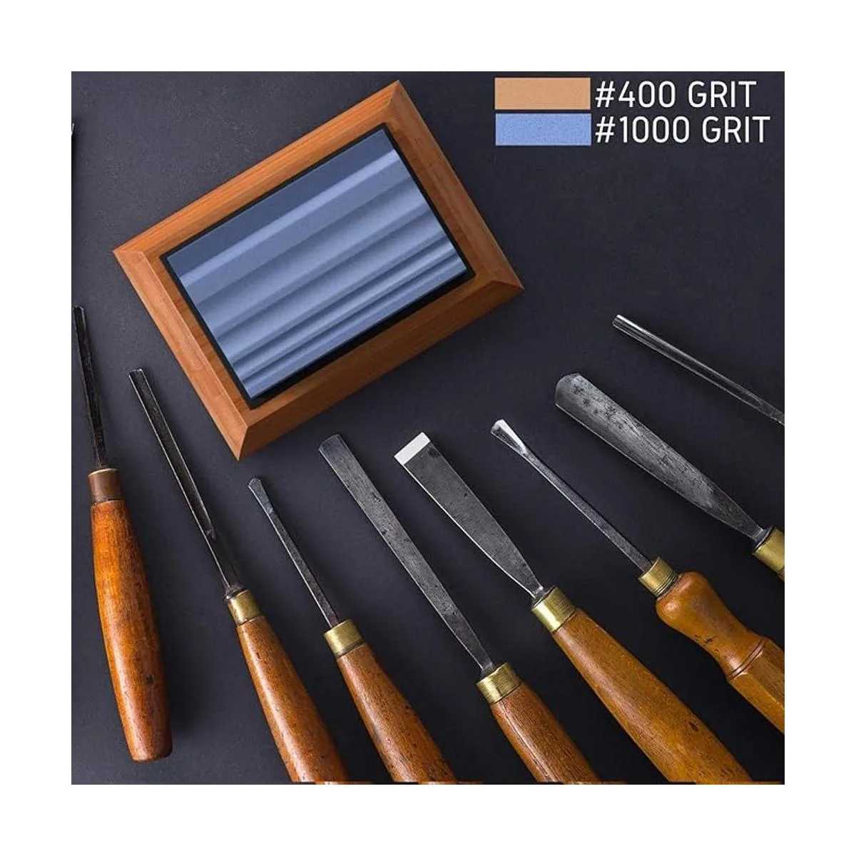 Dos Piedras Múltiples Ranuras: el grano 400 es una piedra agresiva para bordes apagados y dañados. El grano 1000 se utiliza para afilar y pulir los bordes para su mantenimiento. Este afilador de herramientas de tallado de madera tiene ranuras de varios contornos, por lo que es fácil afilar herramientas de carpintería combinando las ranuras de los cinceles con los contornos adecuados de la piedra de afilar. También puede afilar cinceles triangulares y redondos en la parte convexa de las piedras de afilar.