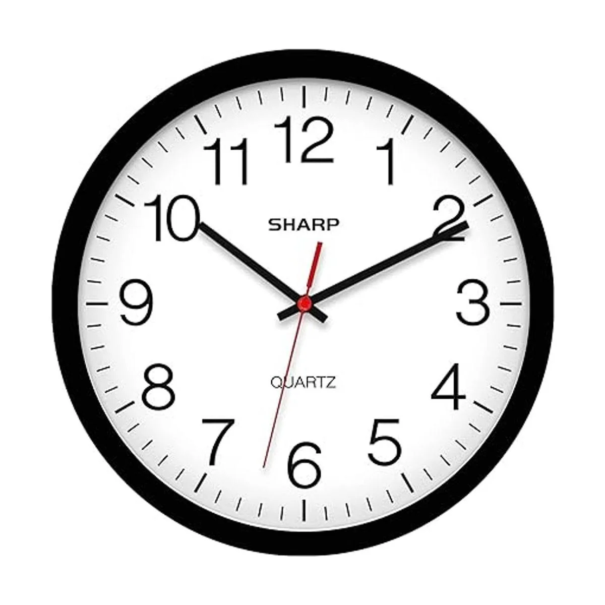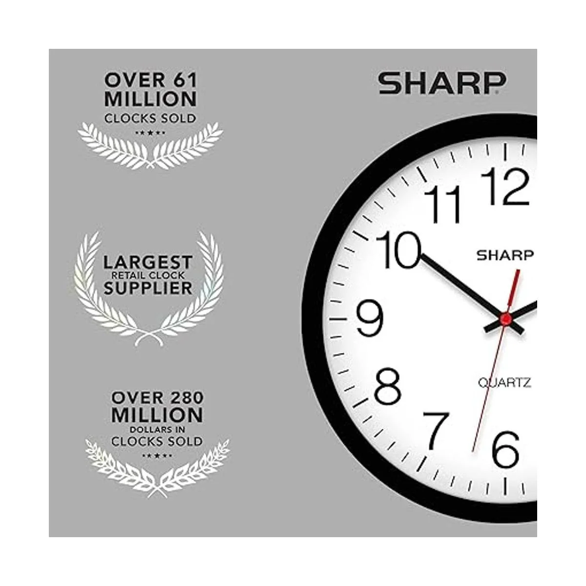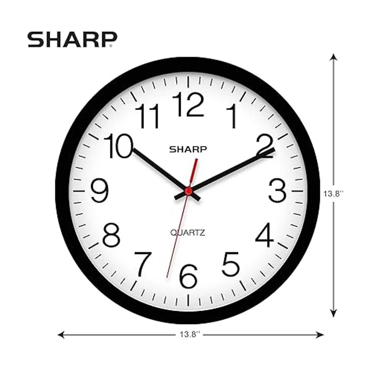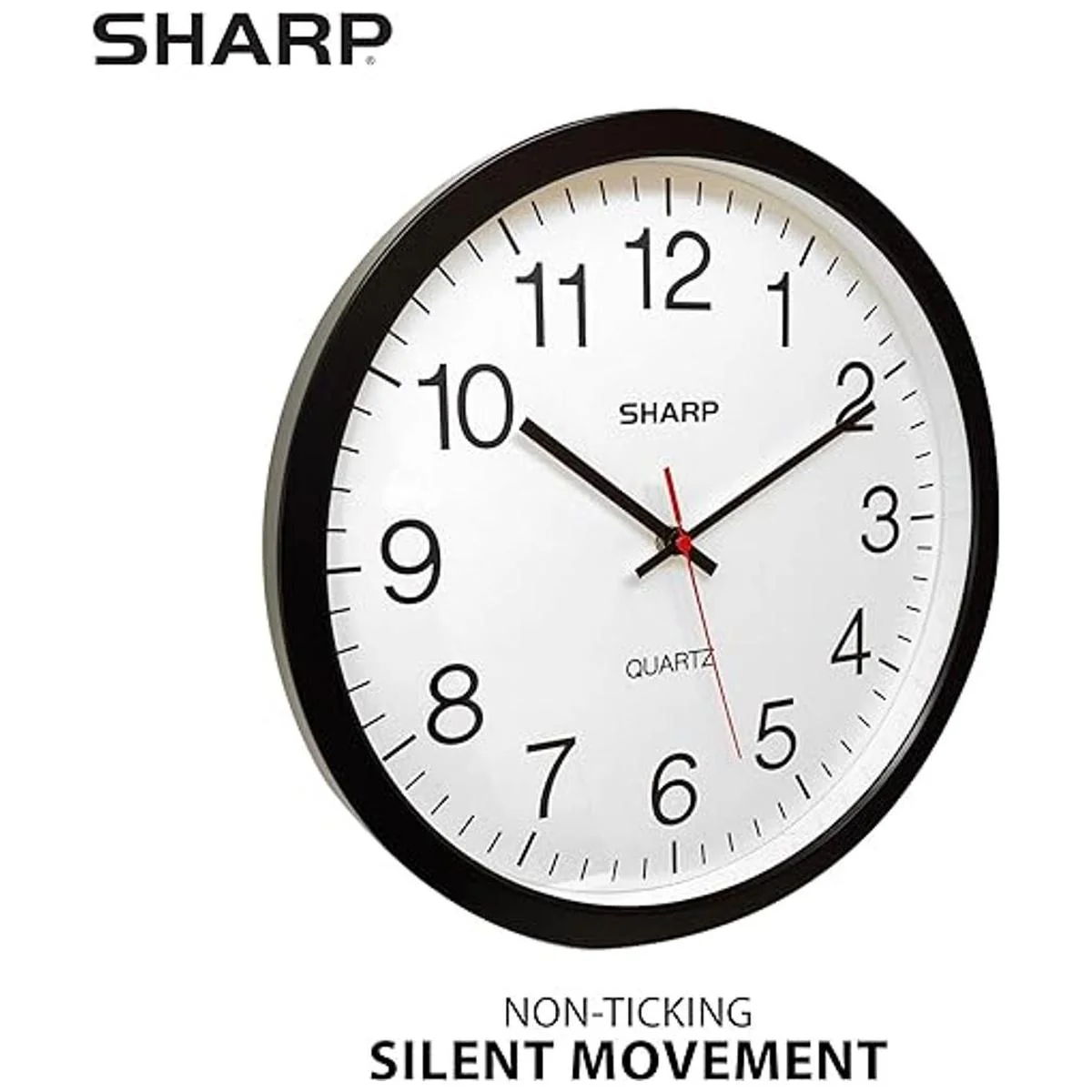 SHARP Reloj de pared Negro, silencioso, sin tictac, cuarzo de calidad de 14 pulgadas, funciona con pilas, redondo, fácil de leer en casa, cocina, oficina, aulaescuela, movimiento de barrido
