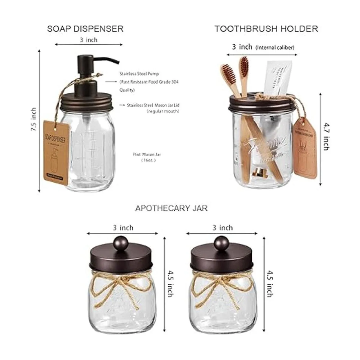 Almacenamiento elegante: crea profundidad, textura y un hermoso espacio mediante el uso del juego de accesorios de baño de tarro de albañiles. Es un bonito juego de accesorios de bronce para el hogar que puedes conseguir. Mantiene el baño organizado y añade un estilo rústico simple. Decoración ideal para la casa de campo. Reutilizable, rellenable, ecológico, cristal reciclable. Los componentes de acero inoxidable 304 evitan el óxido y la corrosión.