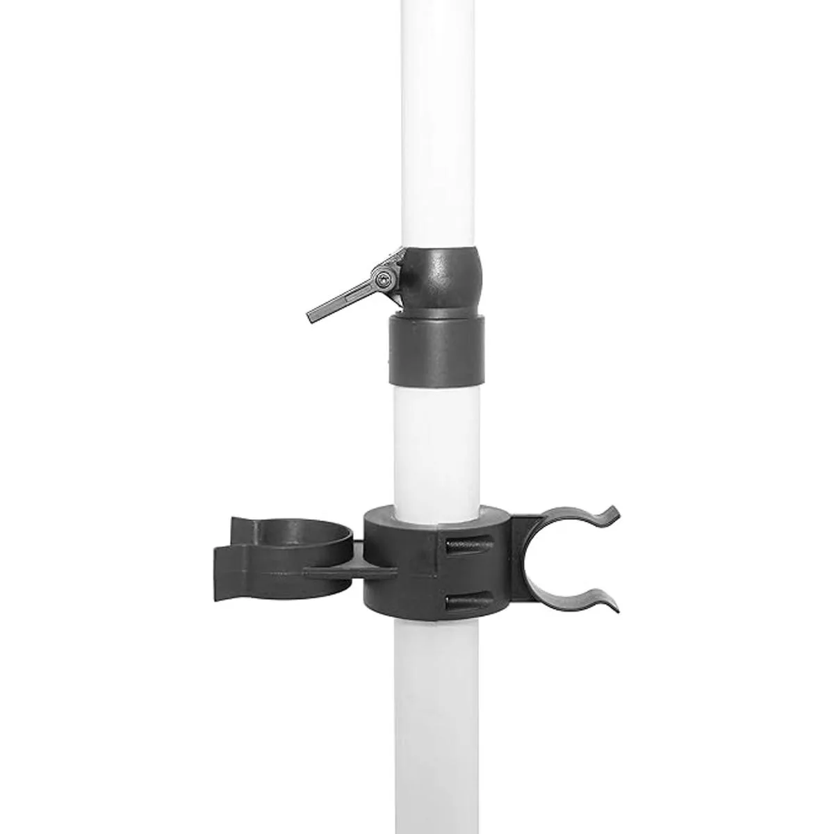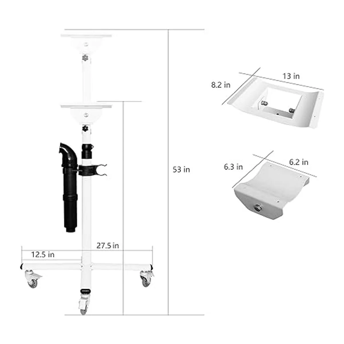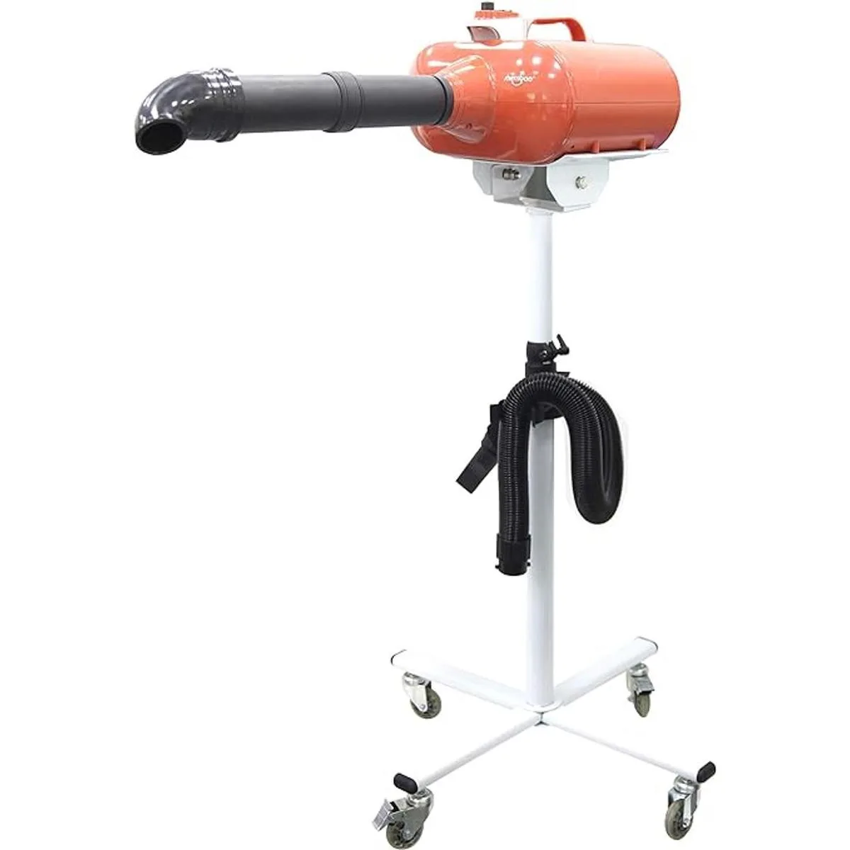 El soporte se ajusta de 83,8 a 50.0 in de altura y gira 360 grados. El soporte también viene con un mango de plástico en el soporte para colgar la boquilla de la manguera de secador que viene con secadores para mascotas.