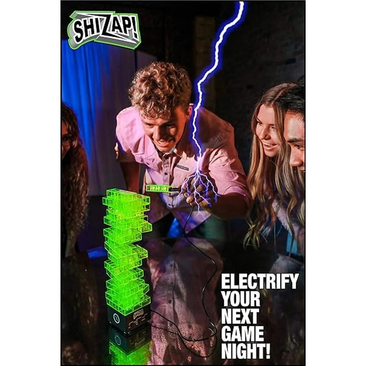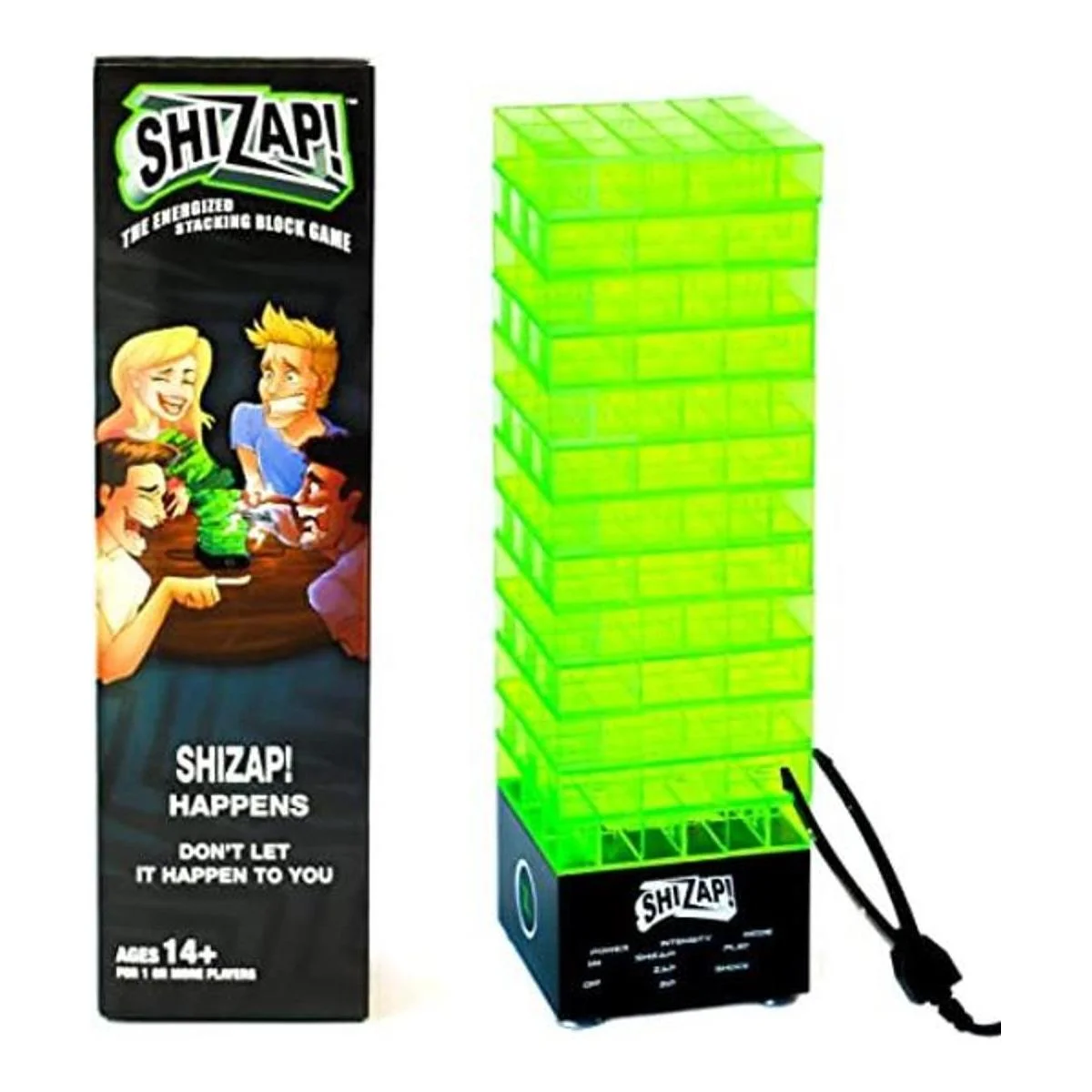 ShiZap Es perfecto para adolescentes y adultos que están cansados de otro juego de bloques de apilamiento de madera, y están en la música que induce el pánico, un espectáculo de luz LED y un zap eléctrico ocasional con su noche de juego.