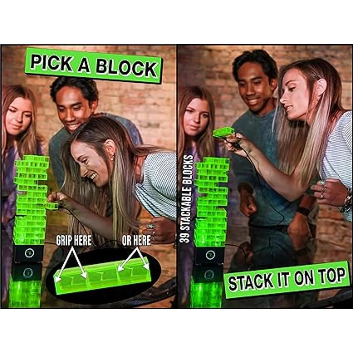 Juega a este juego de bloques apilables y nunca sabes cuándo te vas a quedar impactado Elige tu nivel de dolor, cremallera, zap, o ShiZap. Entonces, elige un bloque, apílalo en la parte superior y pasa las pinzas antes de que te impacte El juego termina cuando alguien golpea la pila y gana un choque de pena, 3 segundos de jugo de perdedor.