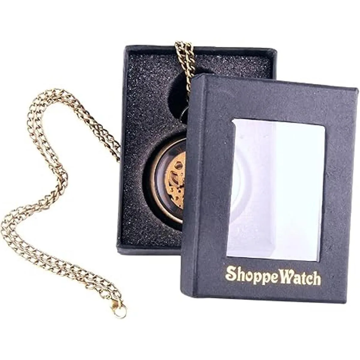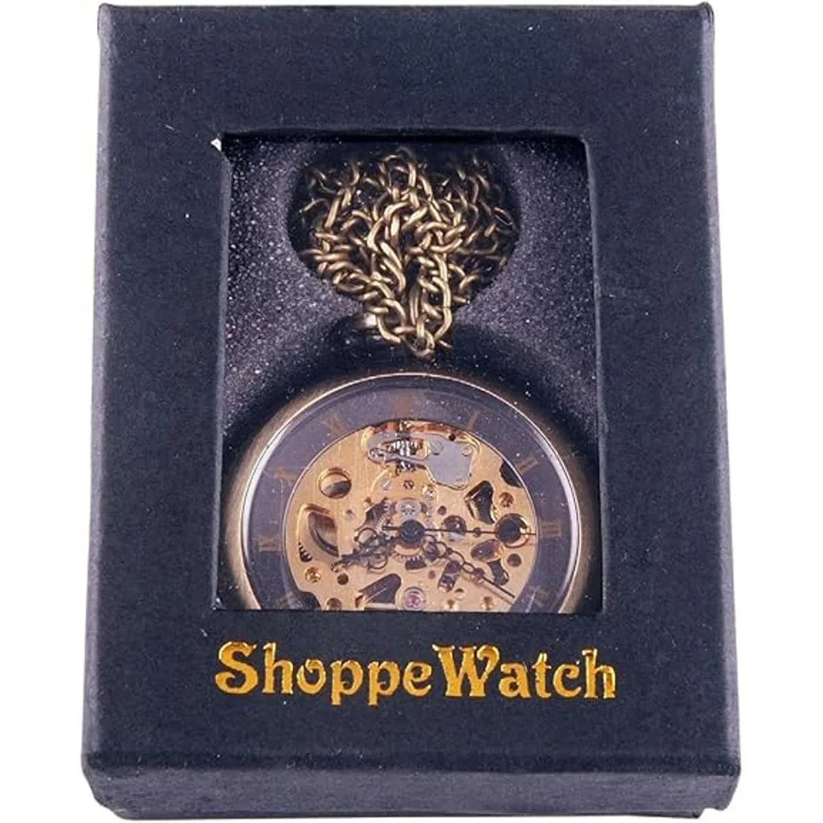 Relojes de bolsillo con nuestra marca privada ShoppeWatch hacer excelente cumpleaños o regalos de Navidad, además de una gran boda y regalos Groomsmen. También son ideales para los regalos corporativos o de la jubilación de un empleado de tiempo largo. Aquí es un ejemplo de un reloj de bolsillo en un diseño clásico para cualquier persona que quiera el aspecto clásico y la practicidad de un mecánico Wind Up de reloj de bolsillo de calidad.