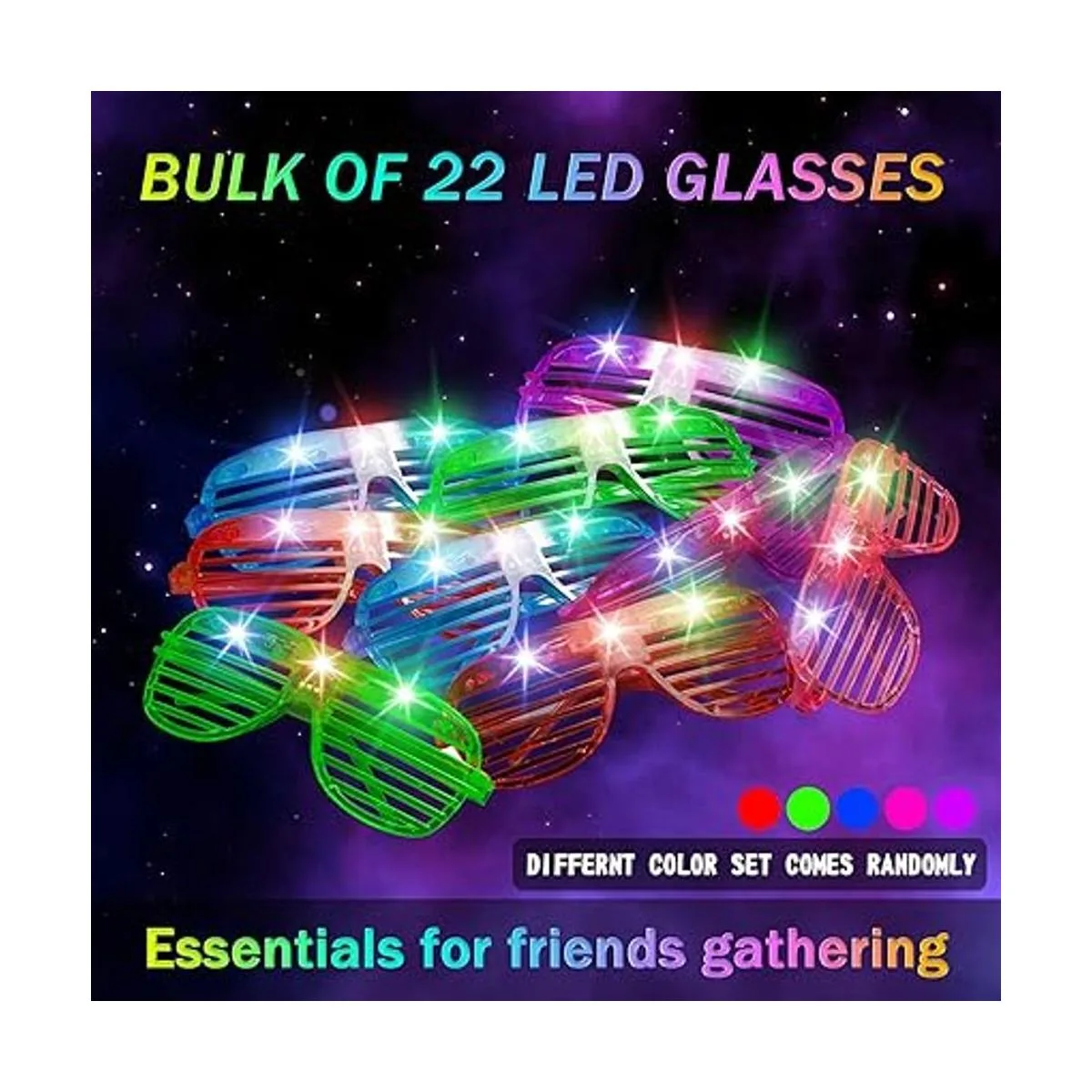 SHQDD Paquete de 22 vasos con varillas brillantes, 5 colores neón con 3 baterías reemplazables, suministros de fiesta que brillan en la oscuridad, juguetes de gafas de sol LED intermitentes, suministros de fiesta de neón a granel para niños, cumpleaños, concierto y vacaciones